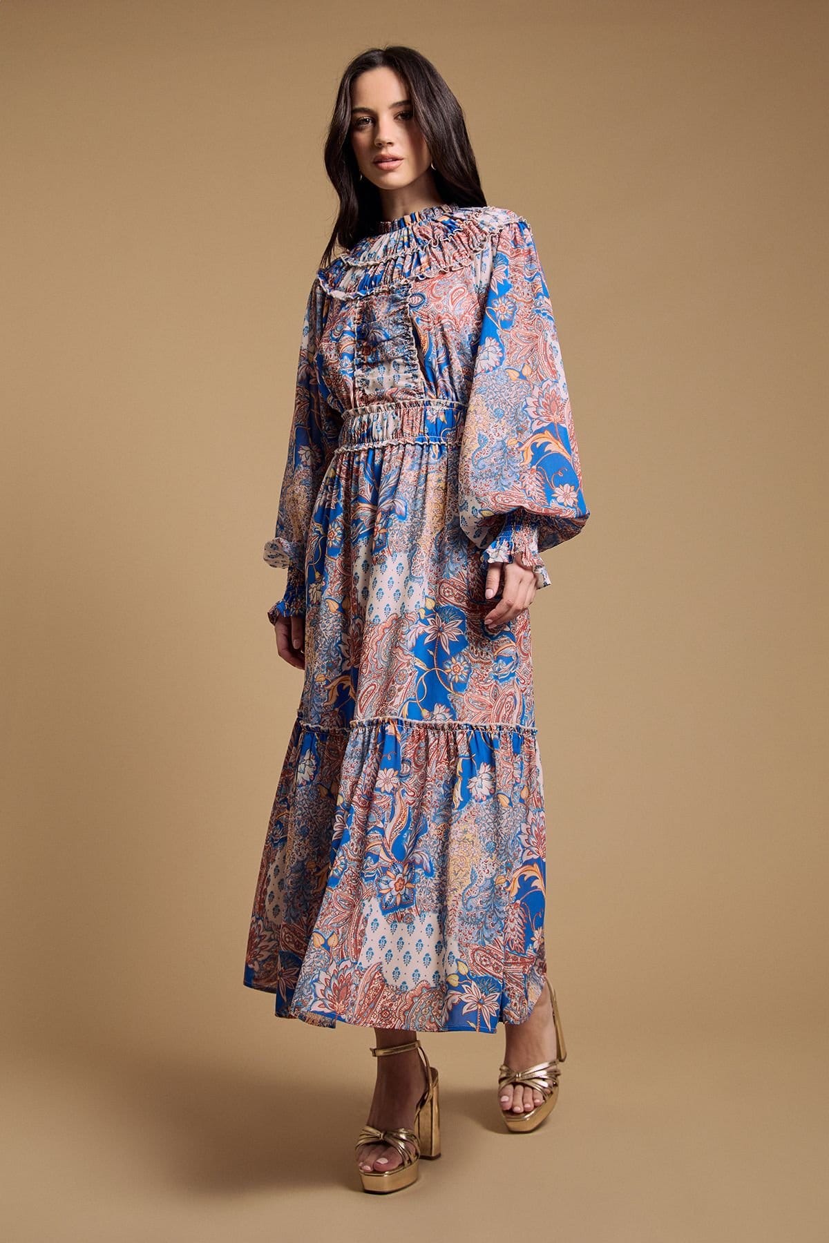 Elegant midi dress with eye-catching ruffle detail at the neckline. Features voluminous balloon sleeves with elasticated cuffs for a dramatic silhouette. The elasticated waistband creates a flattering gathered effect. The tiered skirt design with ruffle hem adds movement and dimension. Made from lightweight chiffon fabric.