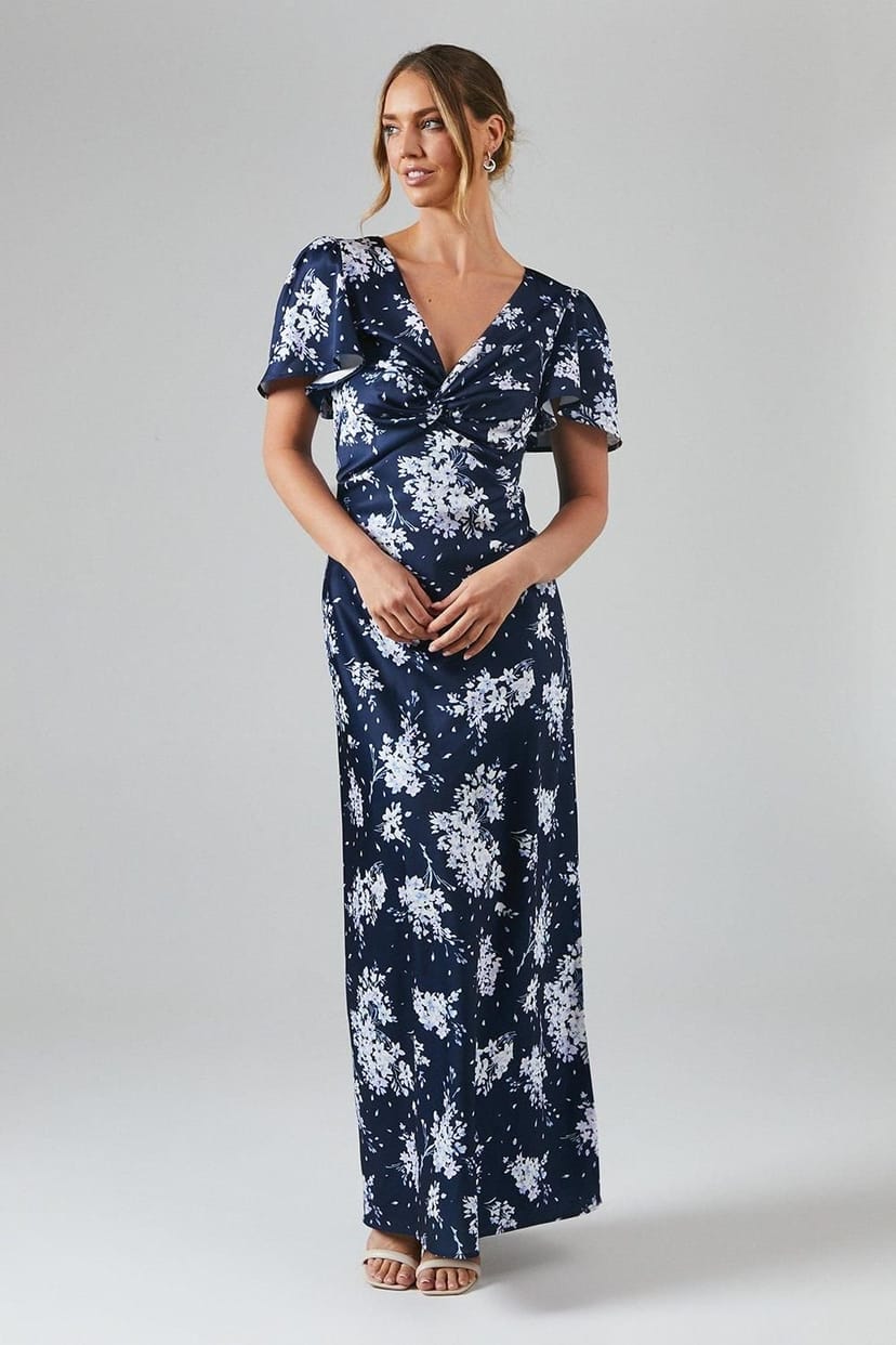 The Oasis Navy Floral Print Satin Maxi Bridesmaid Dress is made from satin.
