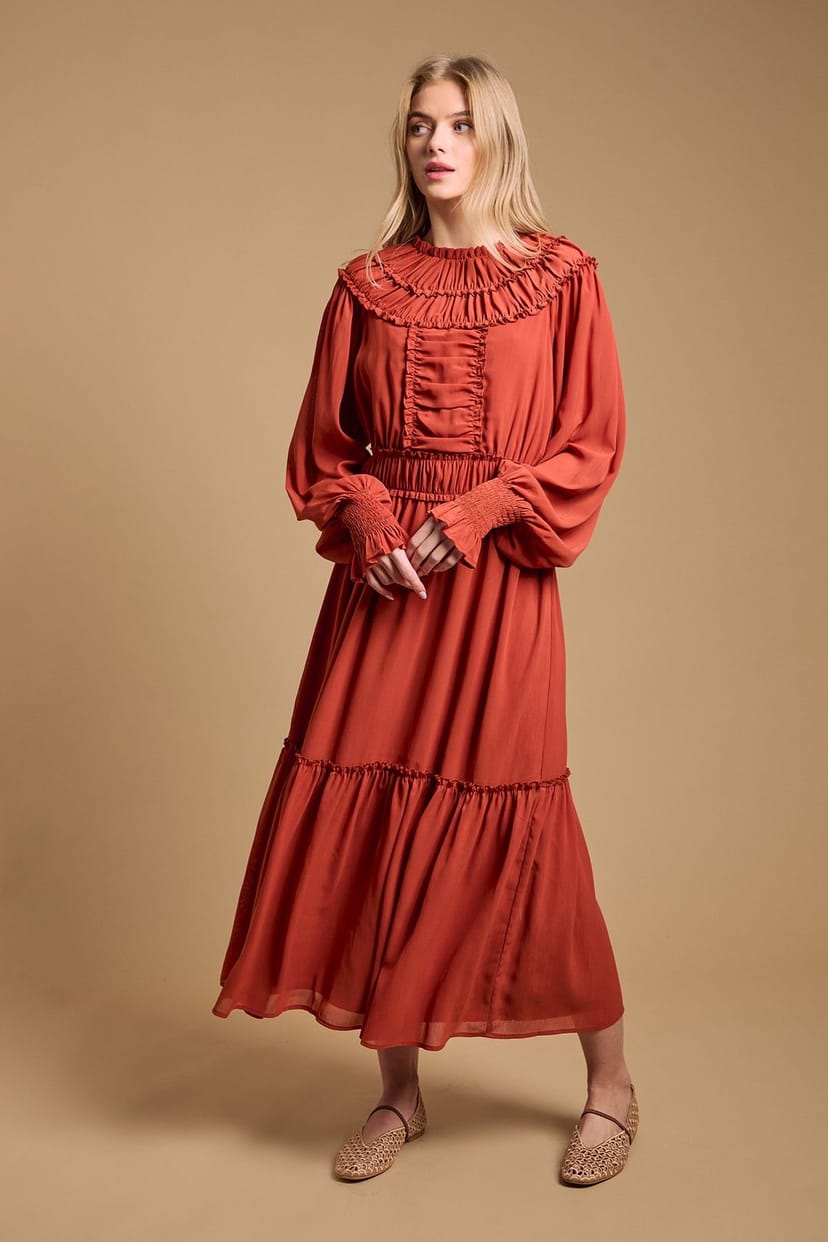 The Oasis Ochre Chiffon Ruffle Midi Dress is made from chiffon.