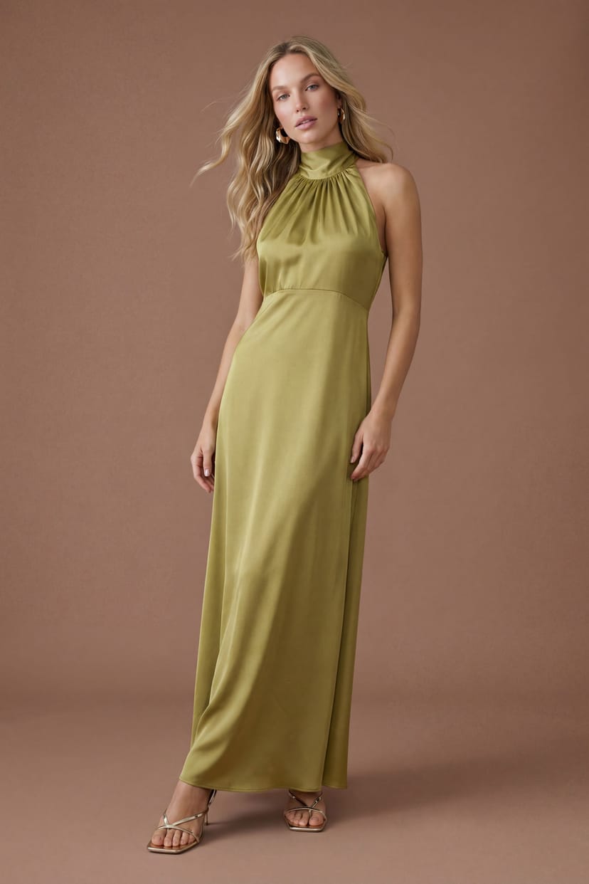 Elegant olive satin maxi dress with a sophisticated halterneck design. Delicate gathering detail at the neckline creates soft dimension. Sleek, streamlined silhouette with floor-length hemline. Defined waistline enhances the feminine shape. Backless design adds a touch of refined allure. Perfect for bridesmaids or evening events.