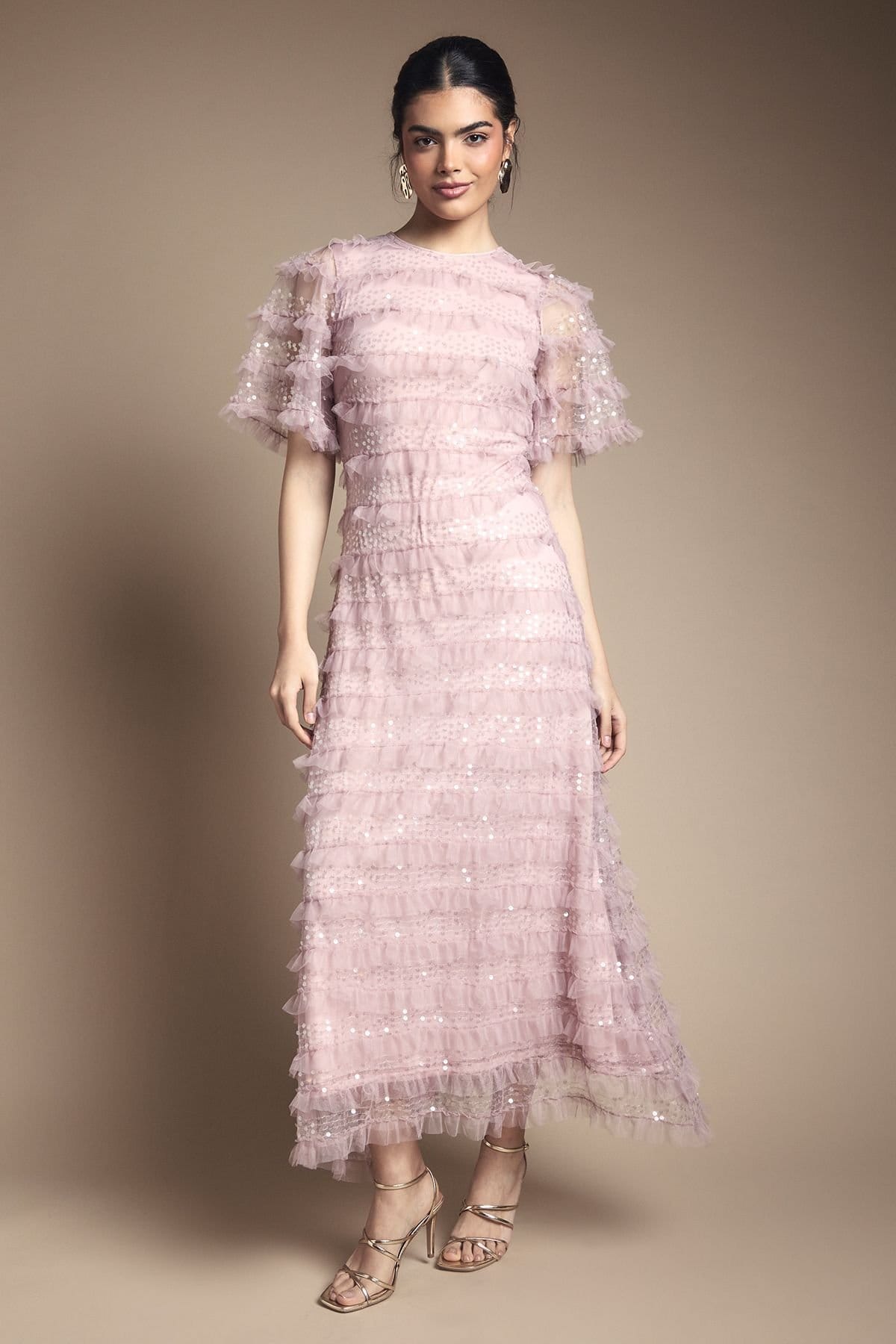 The Oasis Pink Sequin Ruffle Maxi Dress is ideal for evening, party, wedding-guest.