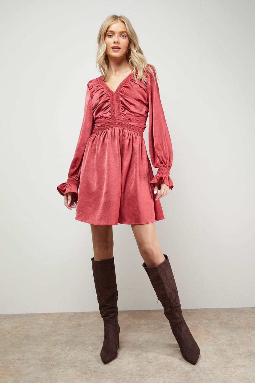Charming rose velvet mini dress with a V-neckline and lace trim detailing. The gathered bodice creates a flattering silhouette, while voluminous long sleeves add a touch of drama. Ideal for evening events or date nights.