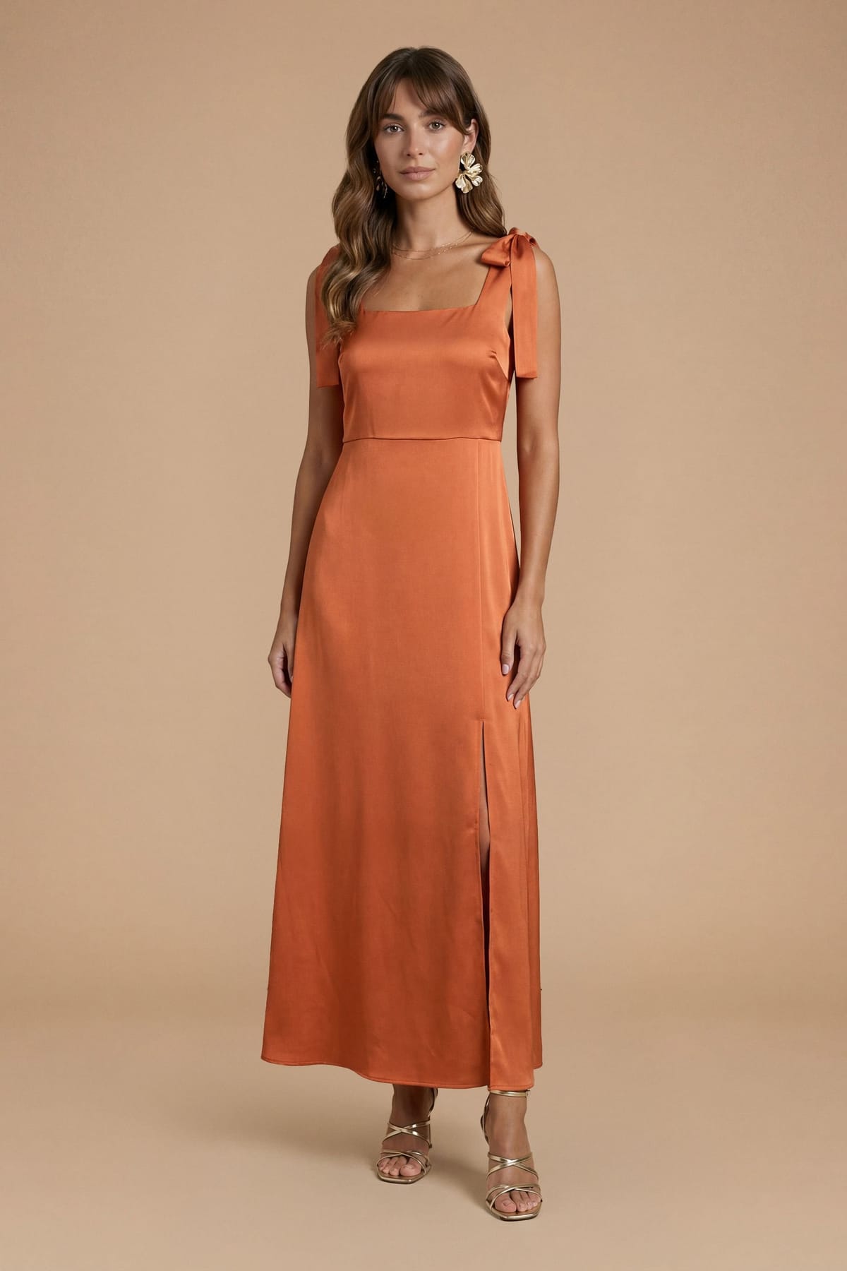 See all outfit ideasThis rust satin midi bridesmaid dress by Oasis features a tie shoulder neckline, slit side detail, and a flattering A-line silhouette. Ideal for special occasions.