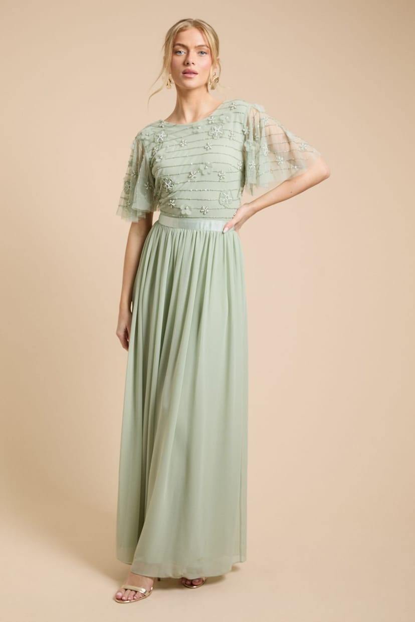 The Oasis Sage Floral Embellished Mesh Maxi Dress is available in sizes 10, 12, 14, 16.