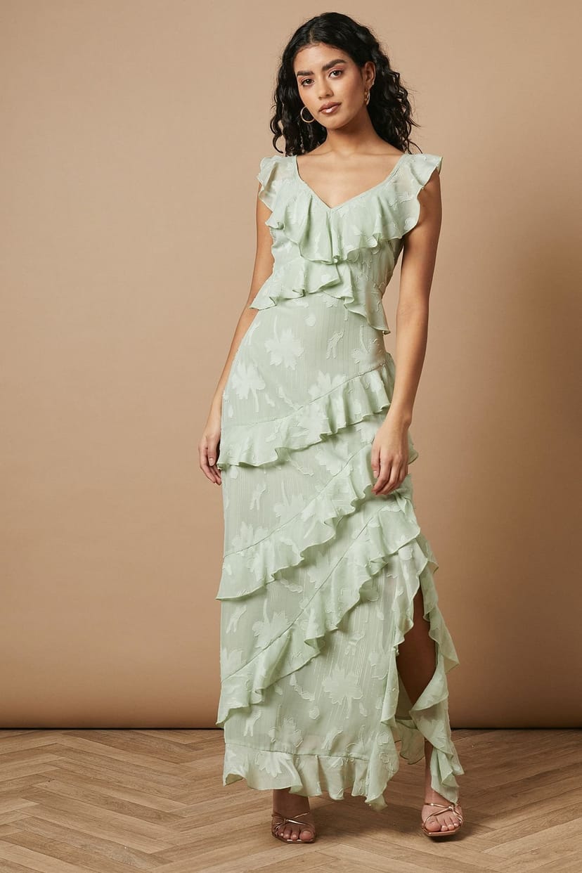 The Oasis Sage Jacquard Print Maxi Dress is available in sizes 12, 14, 16.