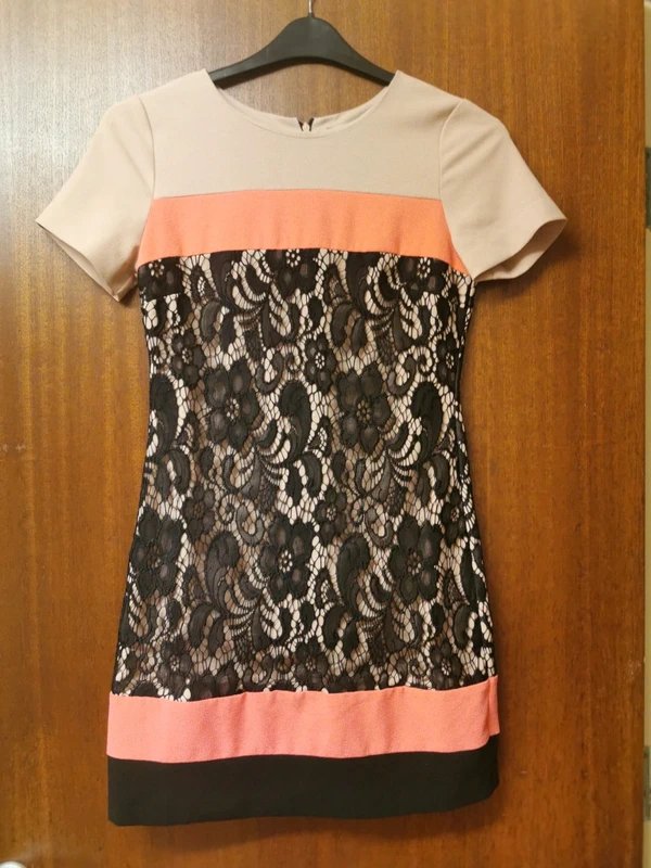 This stunning dress by Oasis features a short-sleeved design with beige and pink panels and black lace detailing over the front. Fully lined under the lace, it offers a sophisticated look with a back zip fastening.