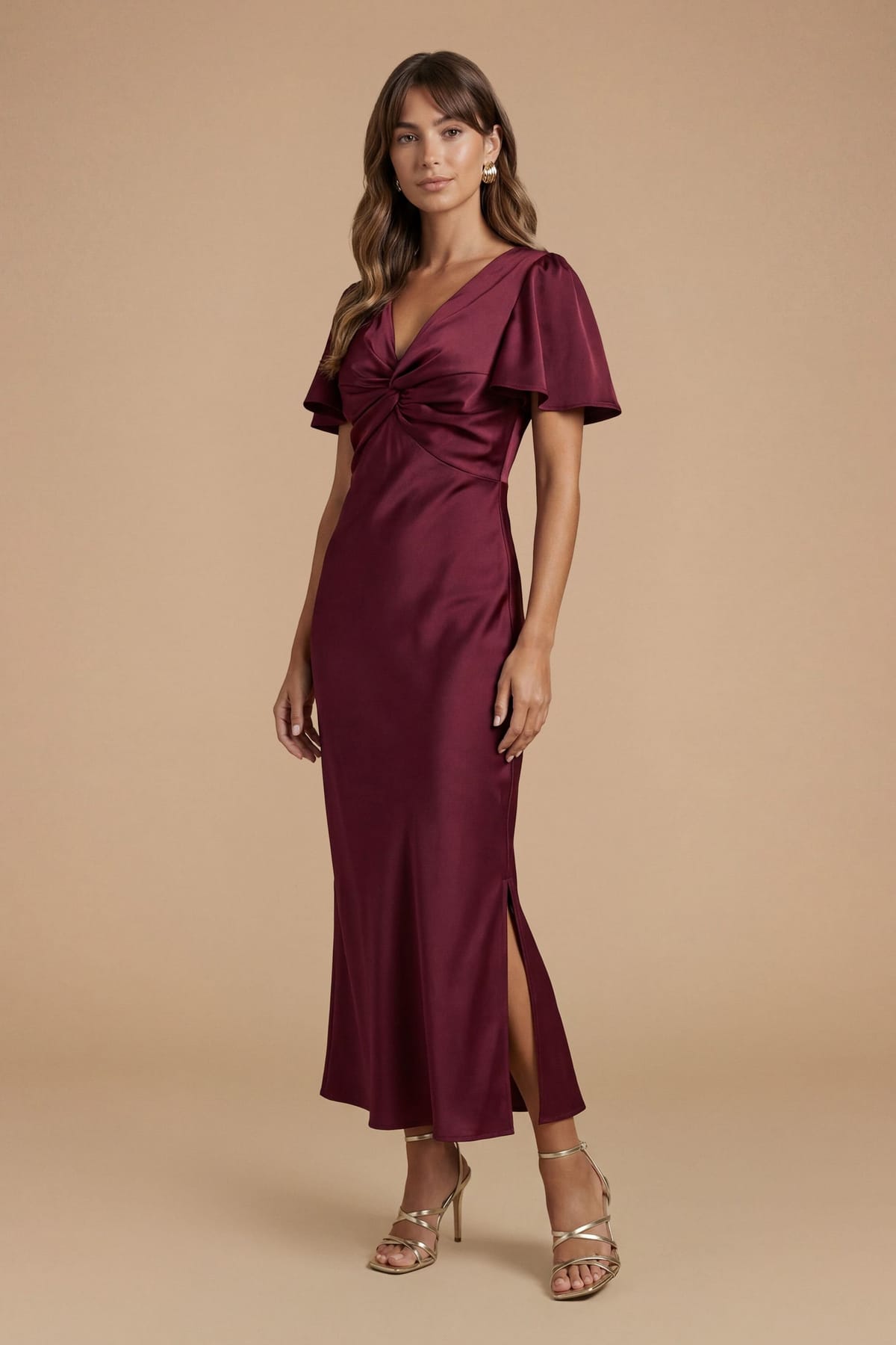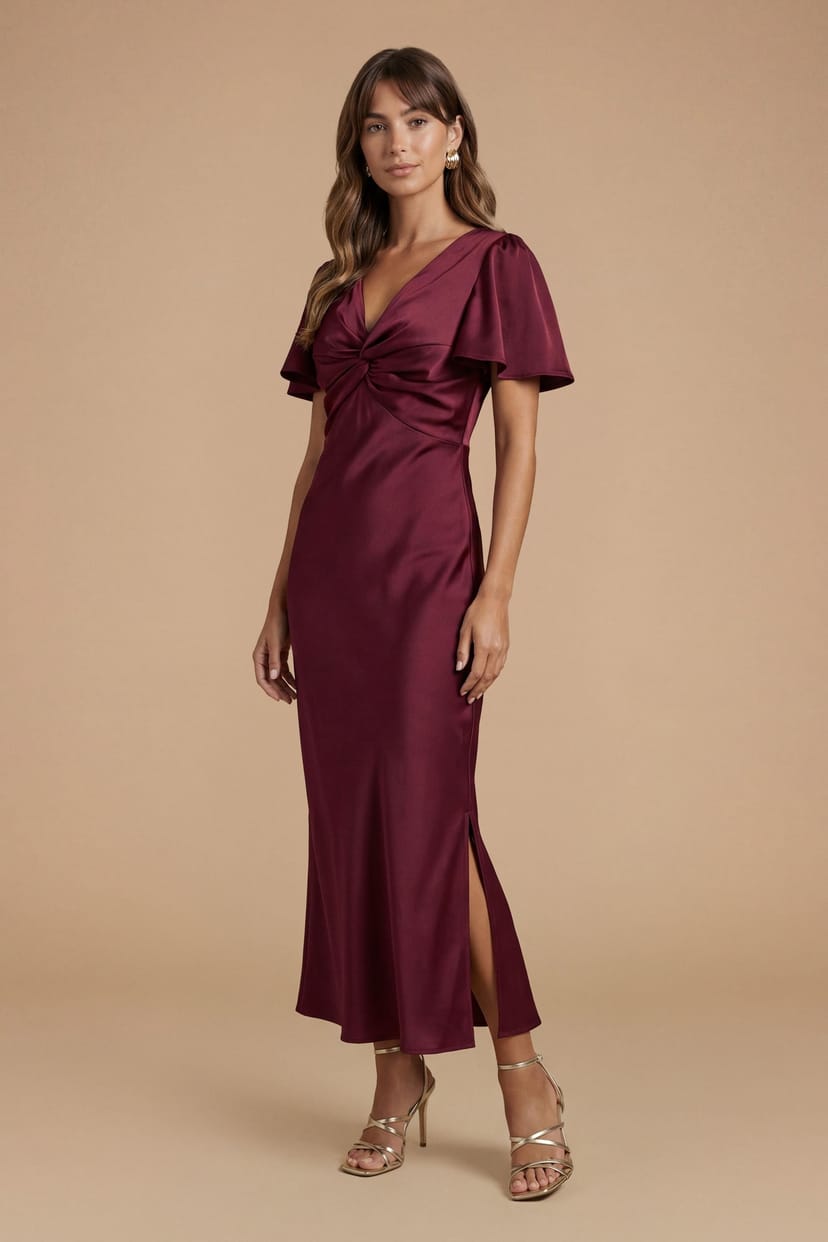 See all outfit ideasThis wine satin midi bridesmaid dress by Oasis features a twist front neckline and angel sleeves. Perfect for special occasions with its elegant drape and flattering silhouette.