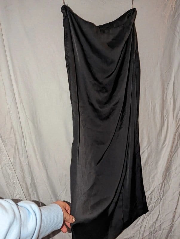 Elegant black satin A-line skirt with a high waistline and floor-length drape. Perfect for evening events or formal occasions.