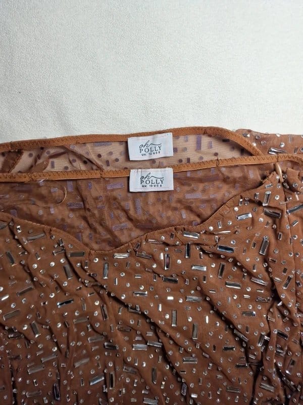 See all outfit ideasThis Oh Polly co-ord set features a sheer crop top and a V-waist skirt, both fully embellished with hotfix diamonds. The brown colour adds a touch of elegance, perfect for a night out or special occasion.