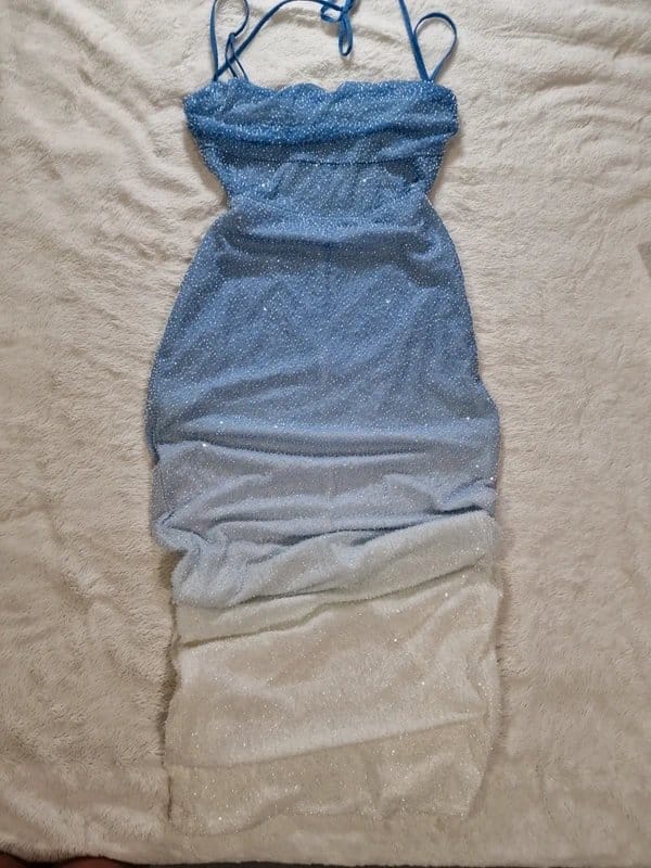 See all outfit ideasThis Oh Polly maxi dress features an ombre blue to white colour gradient with beaded embellishments. It has a cowl neckline with adjustable straps and a back cutout detail with a slit. Perfect for evening events or special occasions.