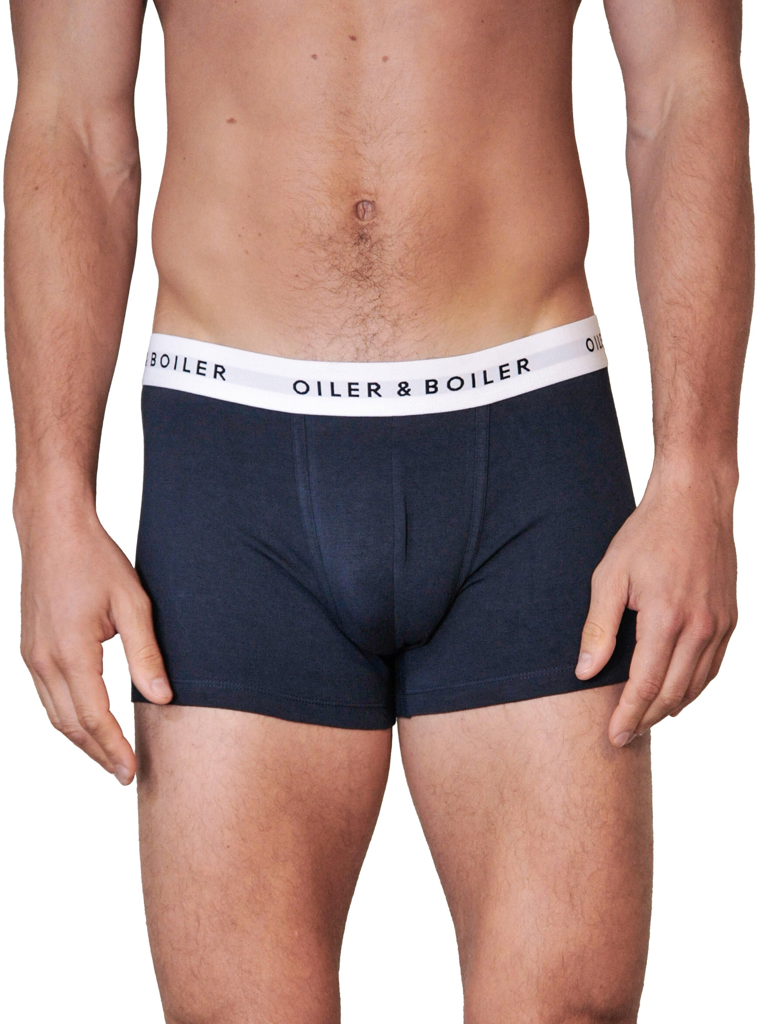 Classic navy blue boxer brief made from fine cotton with a hint of stretch. Features a comfortable elastic waistband with the brand name 'OILER & BOILER'. Perfect for everyday wear.