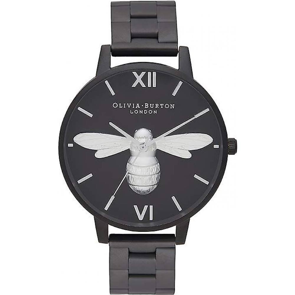 Stylish Olivia Burton watch in black with a unique bee design on the dial. Features a black metal case and a black strap for a sleek look. Perfect for any occasion with its elegant design.