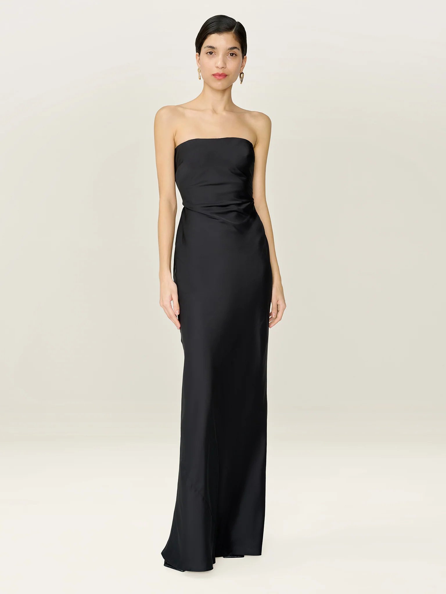 Designed for sophistication, the Amdra Dress from OMNES features a strapless neckline and a fitted silhouette in black satin. This elegant dress enhances your figure with its sleek lines and timeless appeal.