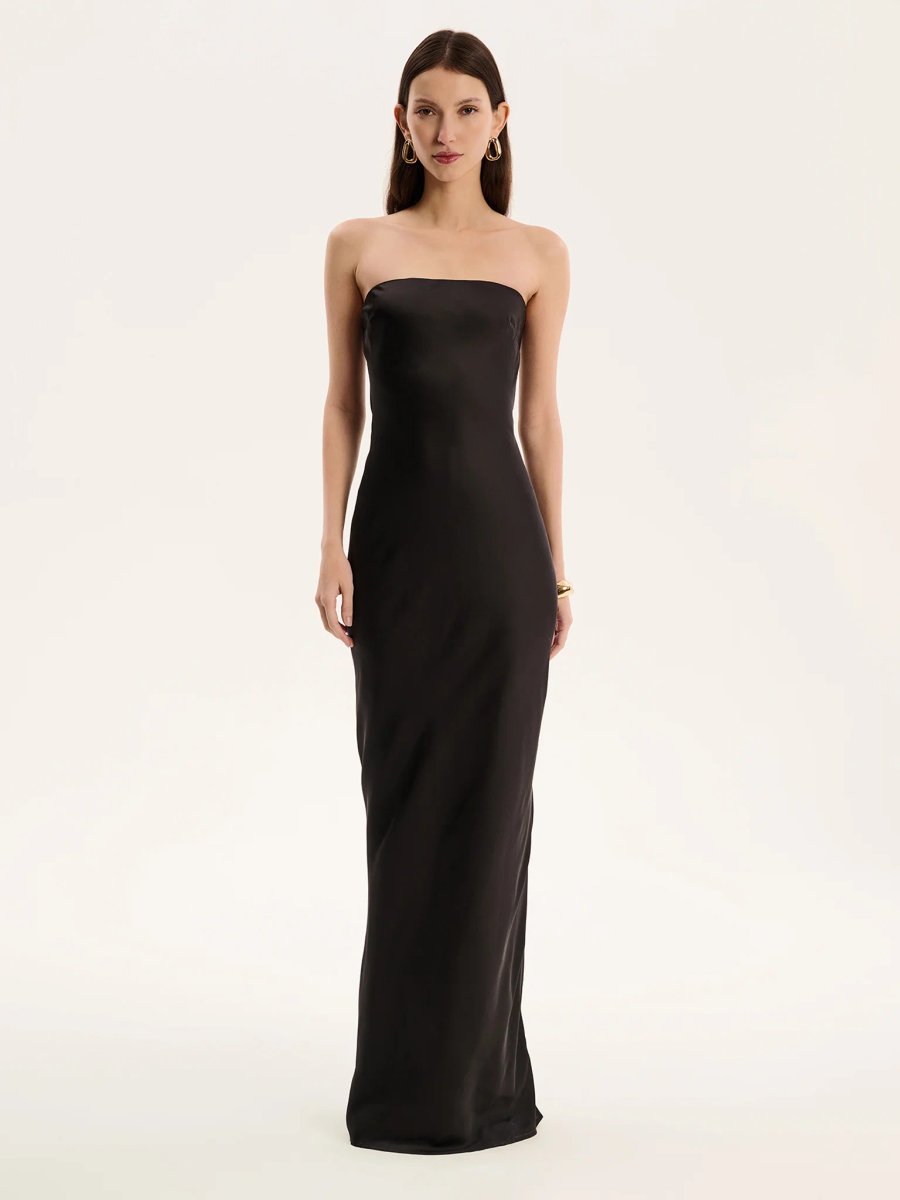This Maxi Dress from OMNES is the epitome of classic elegance. Designed in matte black satin, it boasts a strapless neckline and a fitted silhouette that enhances the body's natural curves. Crafted from slinky 100% recycled polyester, this dress exudes sophistication and comfort.