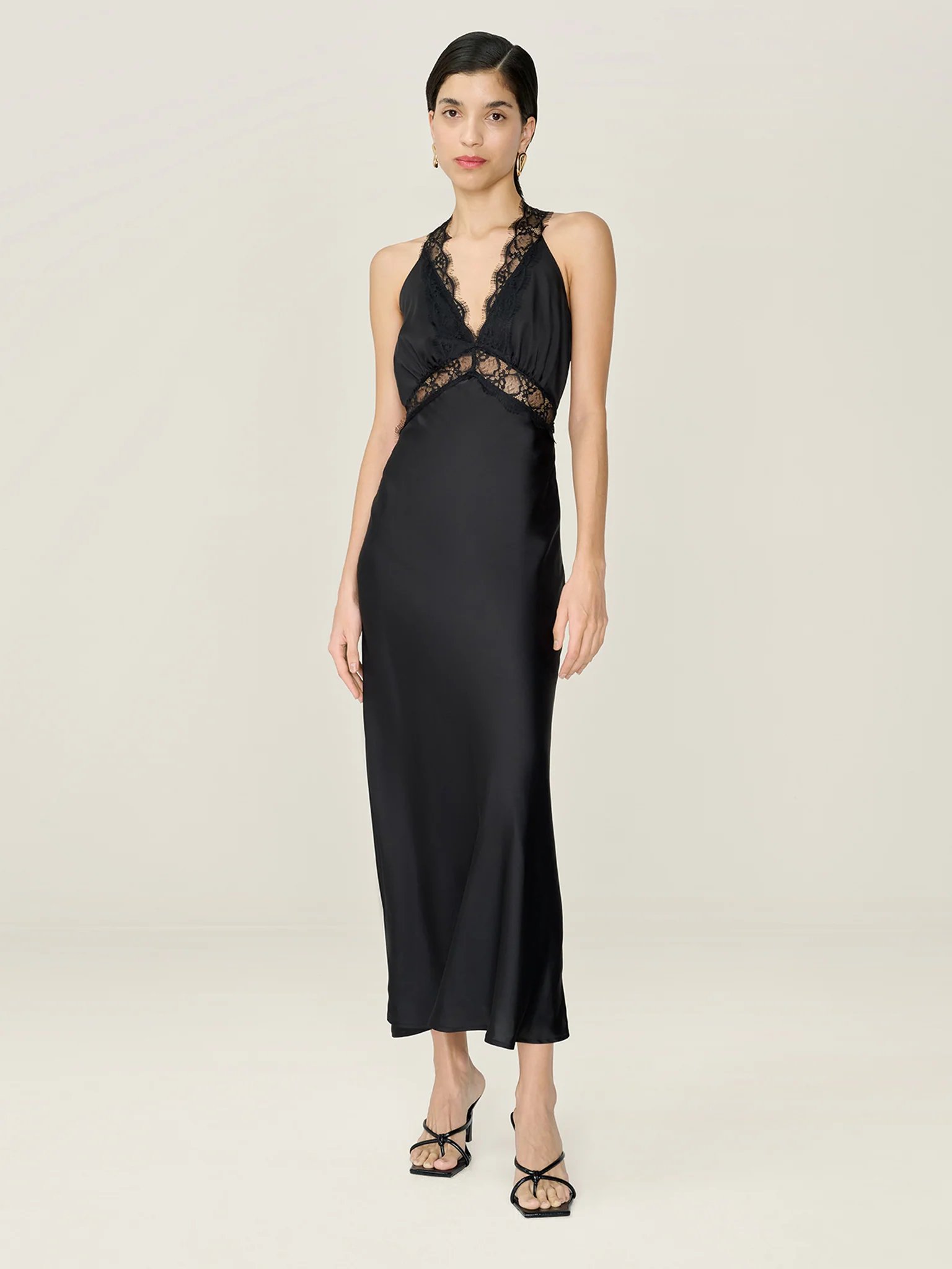 The OMNES Black Aurelia Dress with Lace Detail is made from satin, lace.