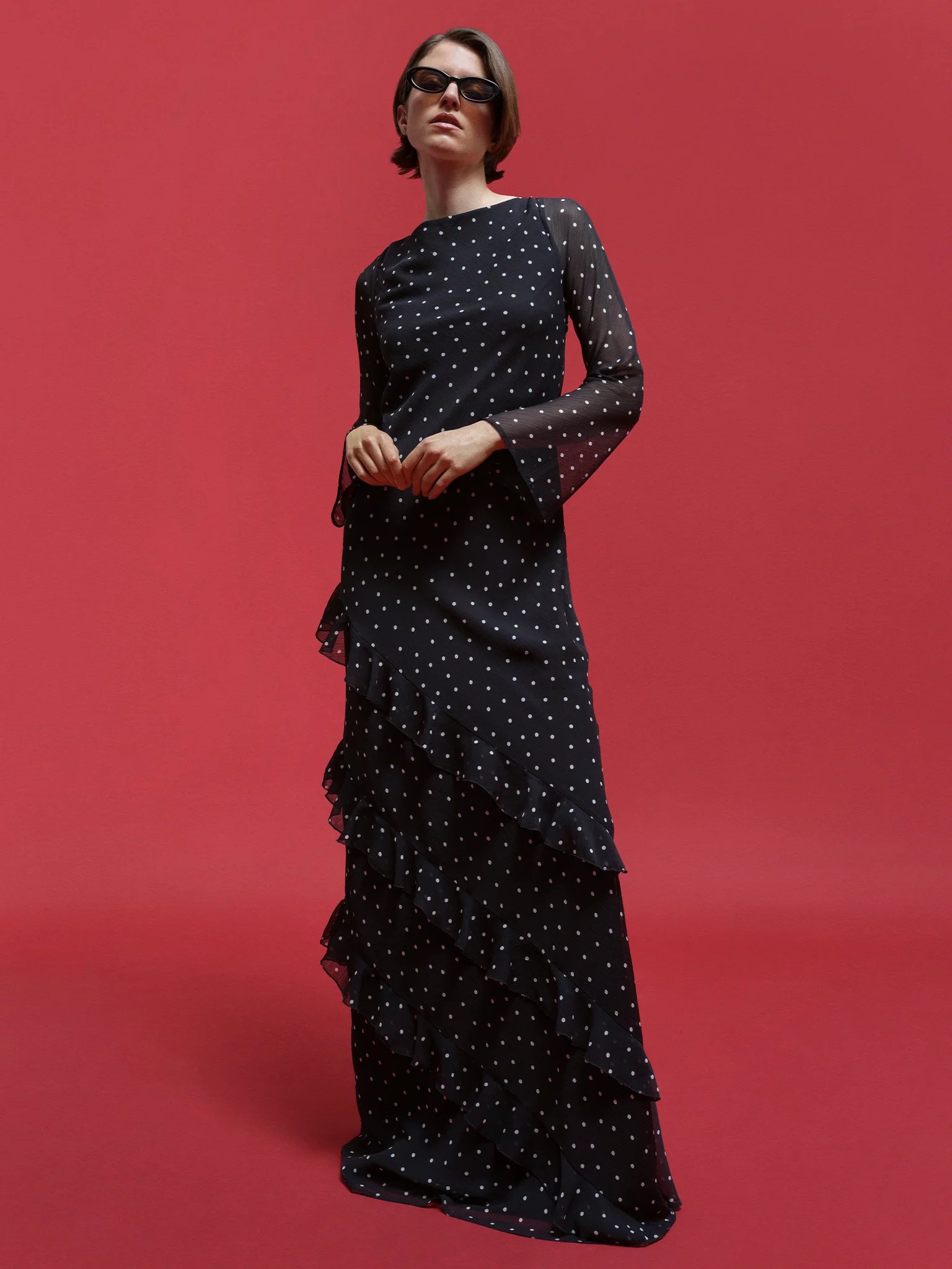Designed with black polka dot, high boat neck, and long fluted sheer sleeves, this elegant yet flirty maxi dress is made for occasions that call for understated impact. The tiered frill hem adds soft volume and movement.