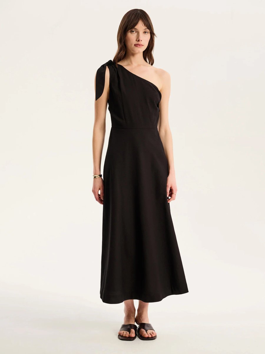 The OMNES Elegant One-Shoulder Midi Dress in Black is ideal for date-night, casual, smart-casual.