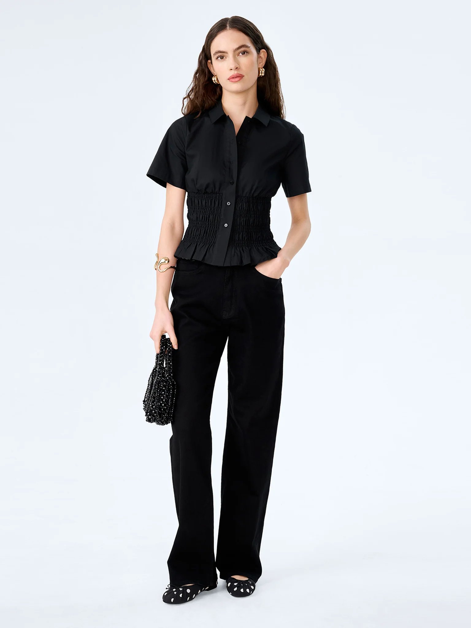The Merida blouse is a fresh take on classic tailoring. Crafted from soft black cotton, it features a collared neckline and short sleeves, balanced by a softly shirred waist that defines the waist. Finished with a playful frill hem and mock pearl buttons, Merida is polished yet easy, perfect for dressing up your daily rotation.