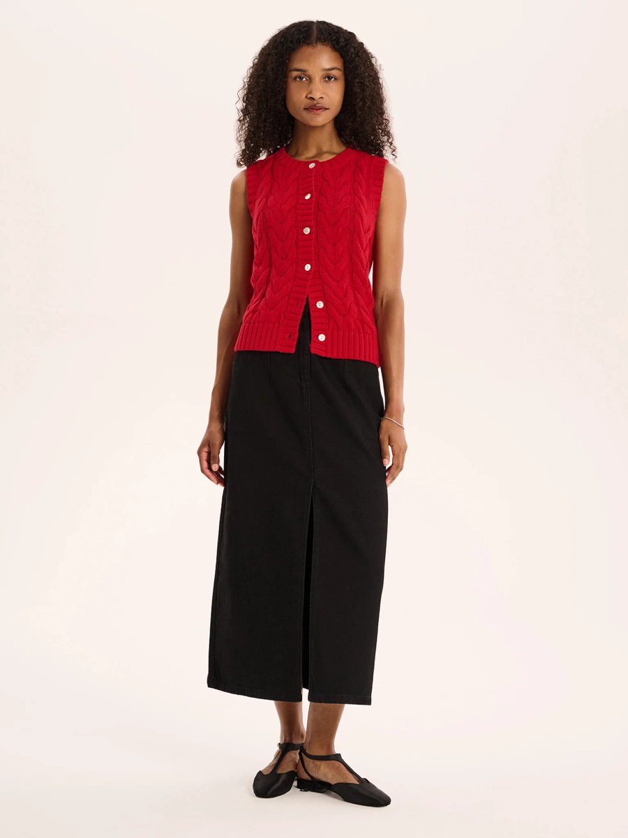 Designed with black, softly structured denim, A-line silhouette, she has a delicate pleated detail at the waist and cheeky front slit to show a bit of leg.