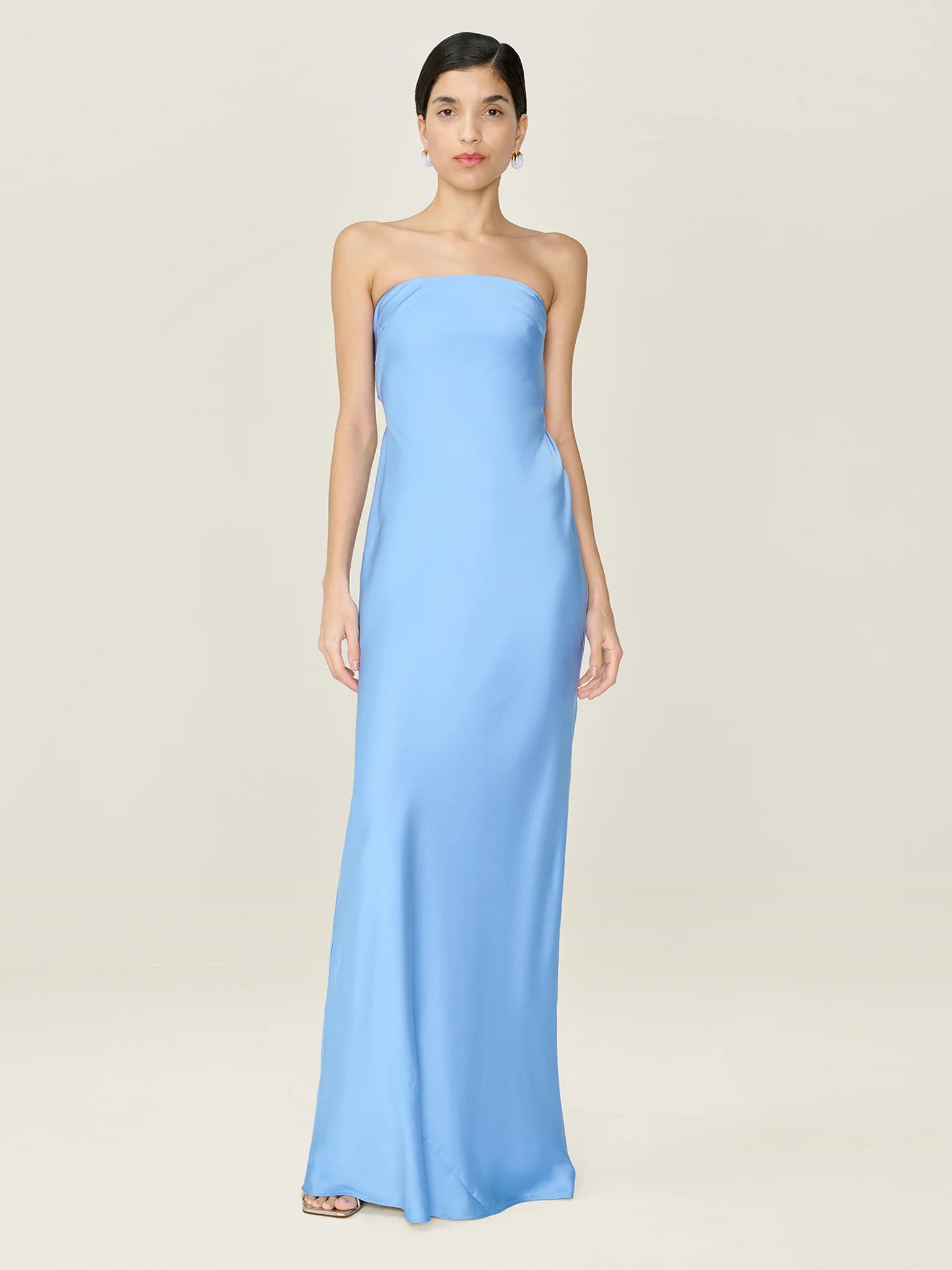 The OMNES Elegant Strapless Vista Blue Dress is made from satin.