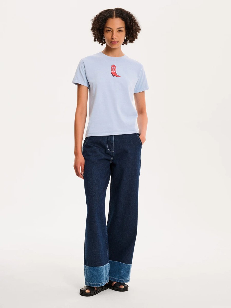 Designed with a cornflower blue hue, this T-shirt features a hand-drawn illustrated cowboy boot design and a slightly boxy fit. Perfectly cropped, it can be easily layered over your favorite slip skirt or denim.