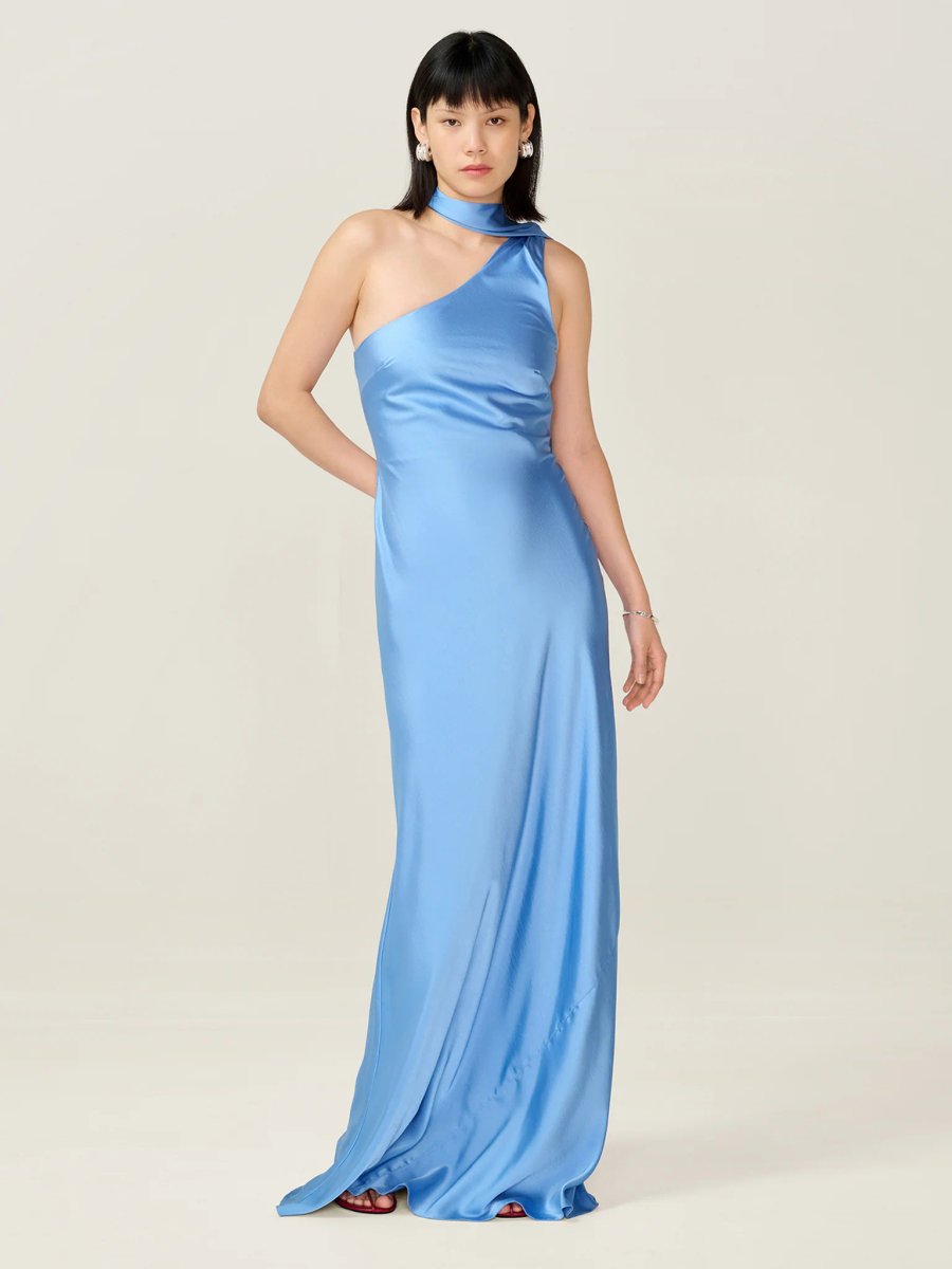 The OMNES Elegant One-Shoulder Maxi Dress in Vista Blue is available in sizes 10, 12, 14, 16, 18, 20, 22, 24, 4, 6, 8.
