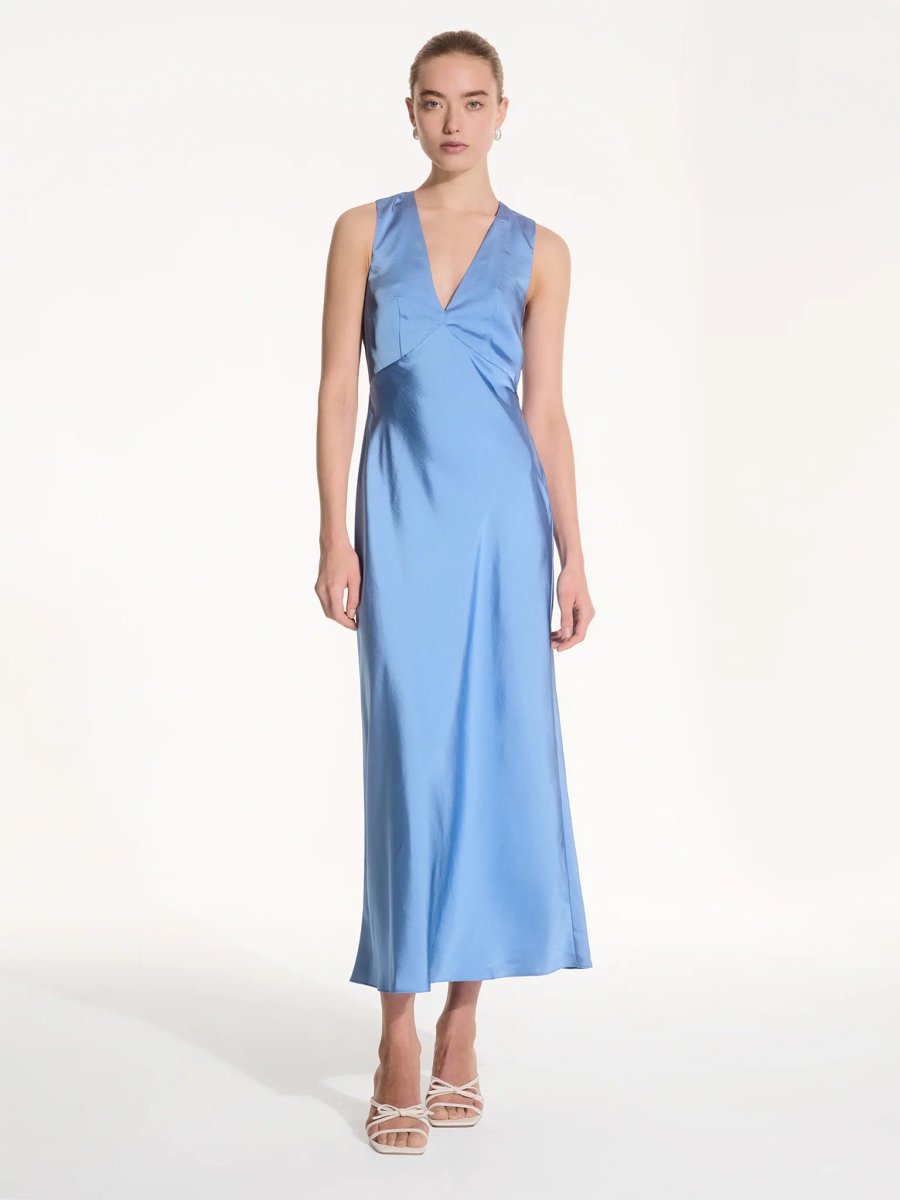 The OMNES Light Blue Satin Maxi Dress is ideal for wedding-guest, evening, formal.