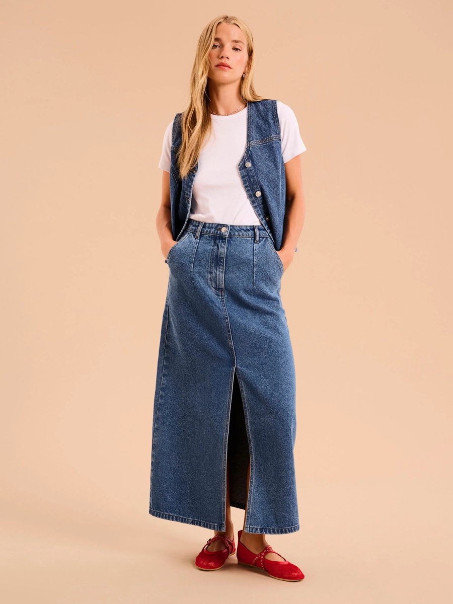 The OMNES Olive Denim Midi Skirt with Front Slit is ideal for casual, smart-casual.