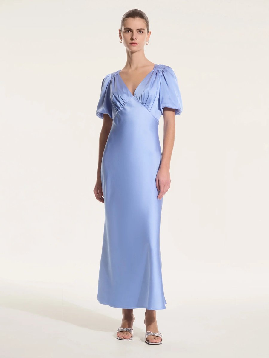 Designed in light blue, this maxi-length dress features ruched puff sleeves and a classic V-neckline. Crafted from recycled satin, it offers a flowing silhouette perfect for bridal parties and date nights. With a brawny-friendly design, it combines effortless elegance with versatility.