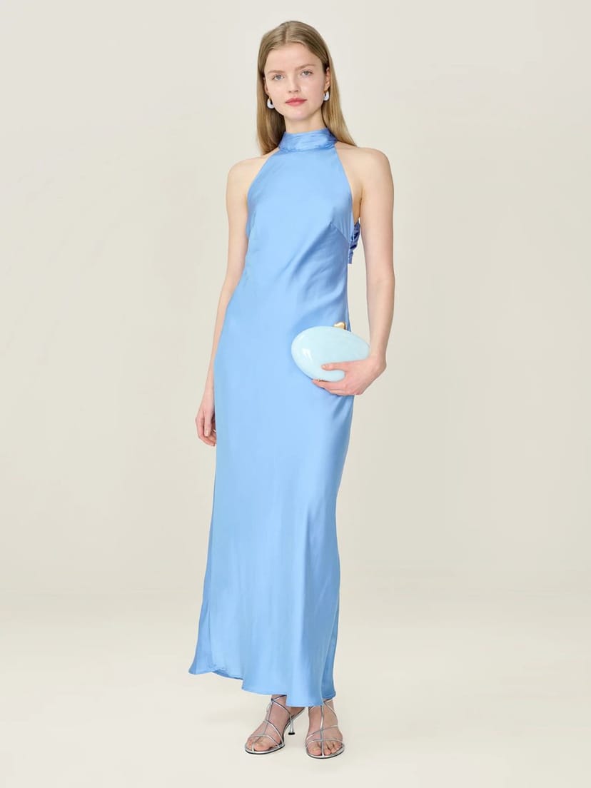 The Vista Blue Satin-like Recycled Polyester Halter Midi Dress is available in sizes 10, 12, 14, 16, 18, 4, 6, 8.