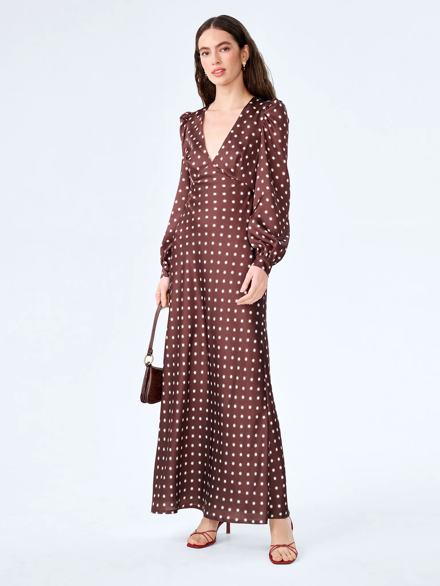 Romantic and refined, this brown midi dress with an all-over starburst print is designed to make a statement. Crafted from a soft, flowing fabric, this elegant piece features a flattering empire line and long sleeves with gently elasticated cuffs. Finished with an open back, sash tie and delicate button fastening at the neck, the romantic silhouette is elevated by the playful starburst print.