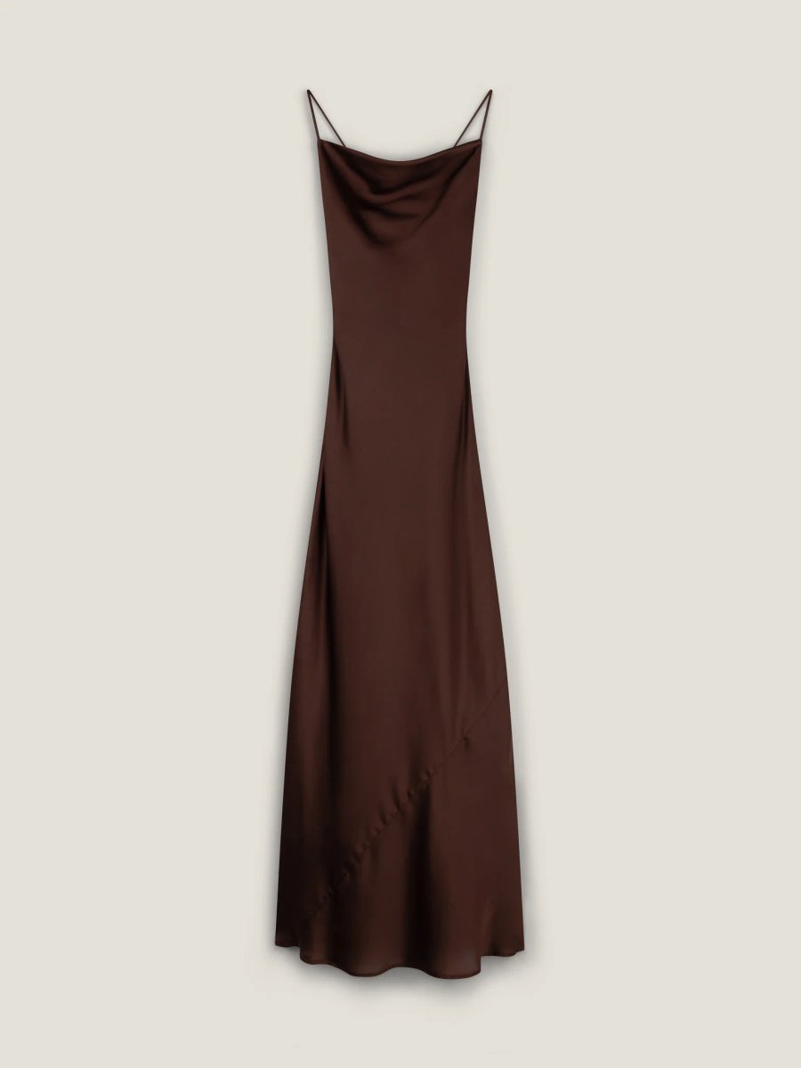 The OMNES Chocolate Satin Maxi Dress is ideal for evening, formal, party.