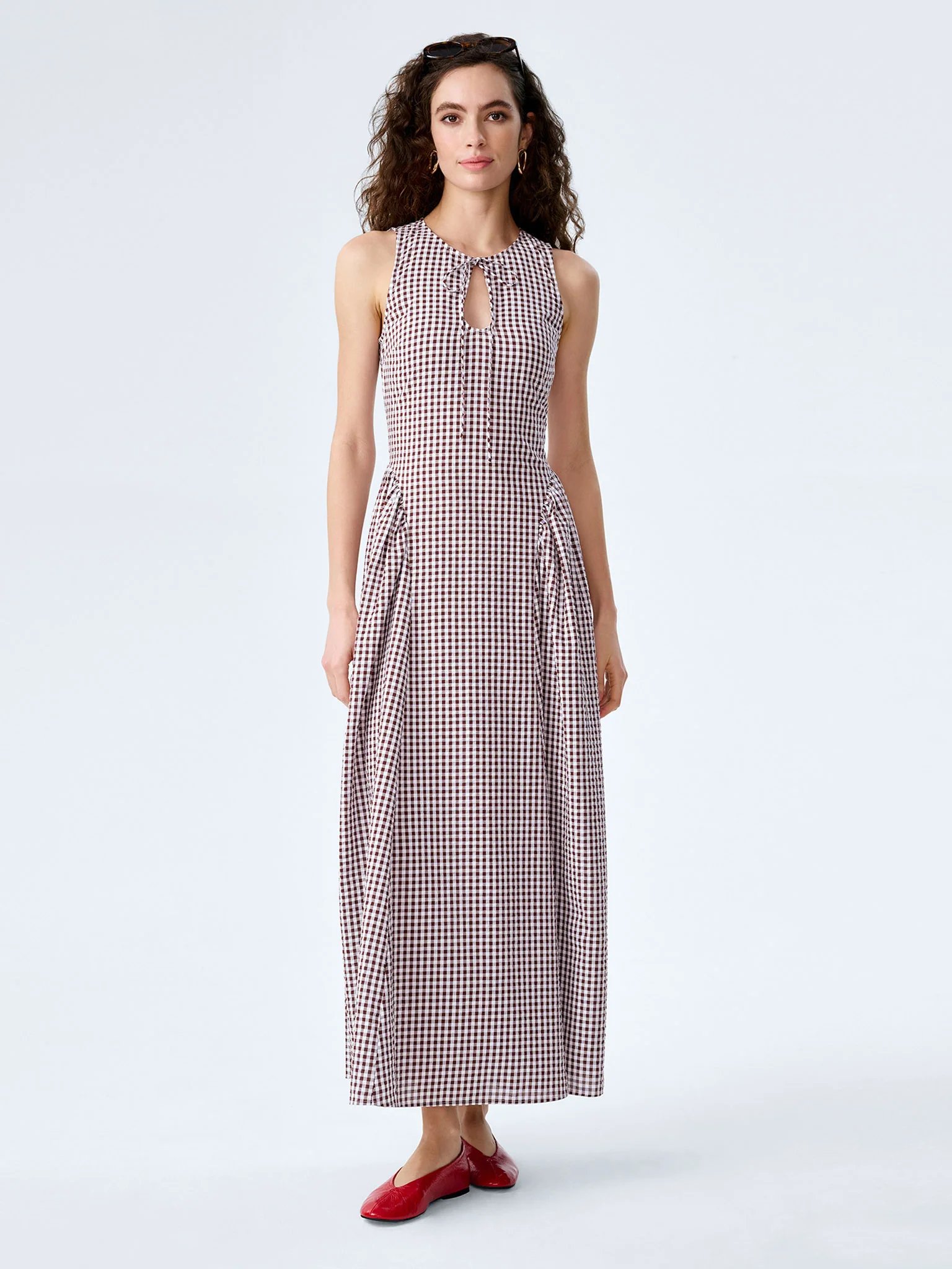 This Margate dress from OMNES offers a contemporary take on a vintage silhouette. Crafted from textured chocolate seersucker gingham, it features a high neckline with a cheeky keyhole cut-out. The corset-style fitted torso defines the waist, transitioning into a drop-waist with a full skirt that balances structure with softness.