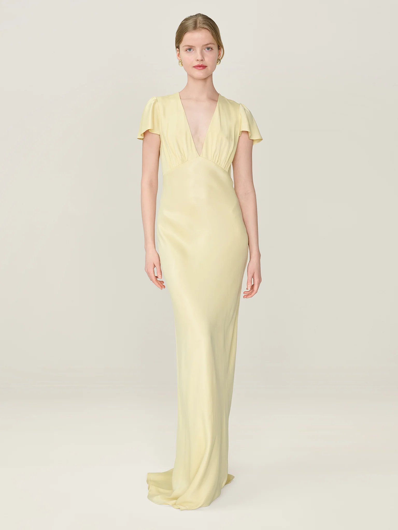 The Fai Dress offers effortless elegance, crafted from slinky viscose satin in butter yellow with a soft, light-catching sheen. It skims the silhouette cascading in a floor-length maxi dress that feels easy to wear and looks timeless. With a flattering V-neckline and delicate cap sleeve, Fai is designed with bridesmaids in mind but is equally headturning at any event.