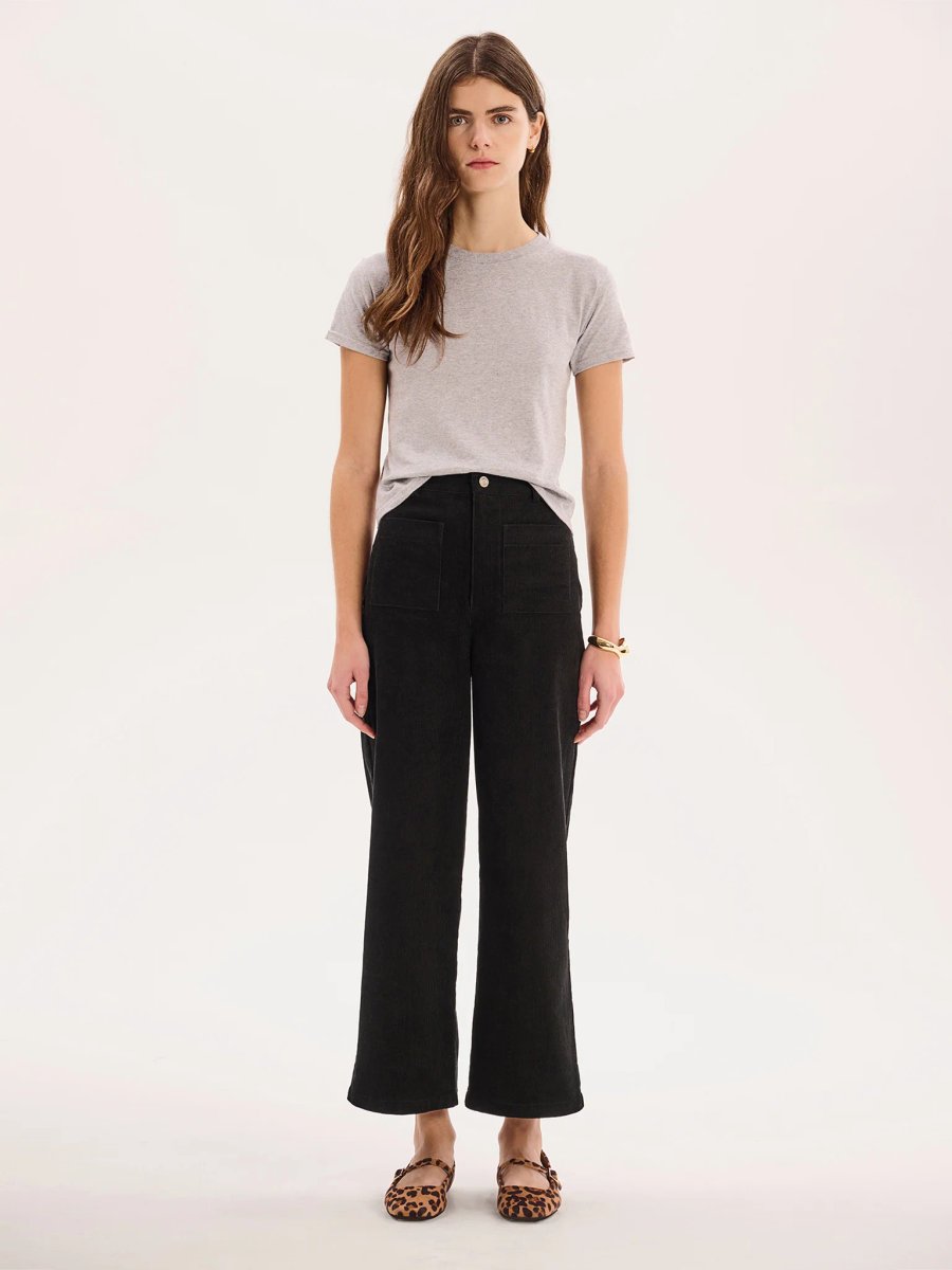 Designed with black, high-rise, slightly flared leg, patch pockets, these corduroy trousers are crafted from 100% BCI member cotton.
