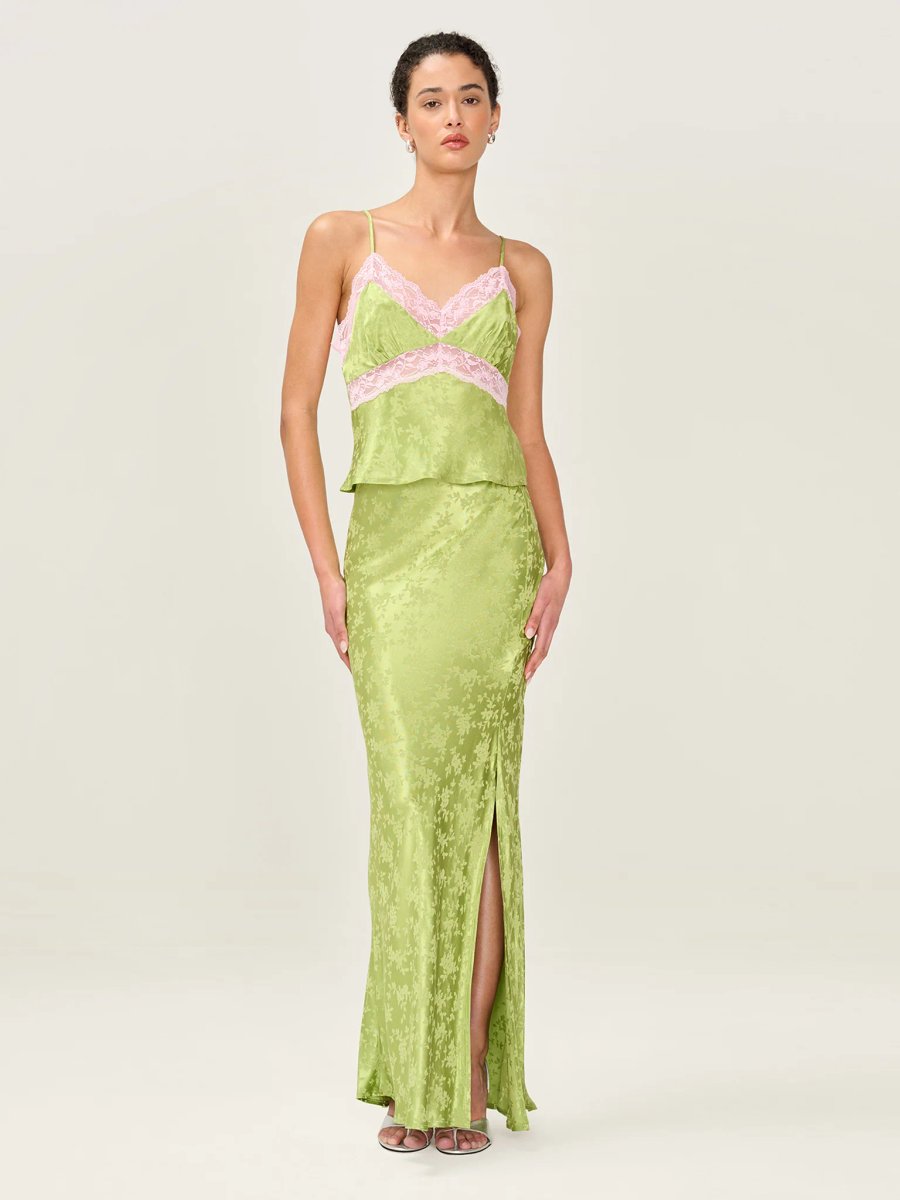 The OMNES Lima Bean Satin Midi Skirt is ideal for evening, casual, business.