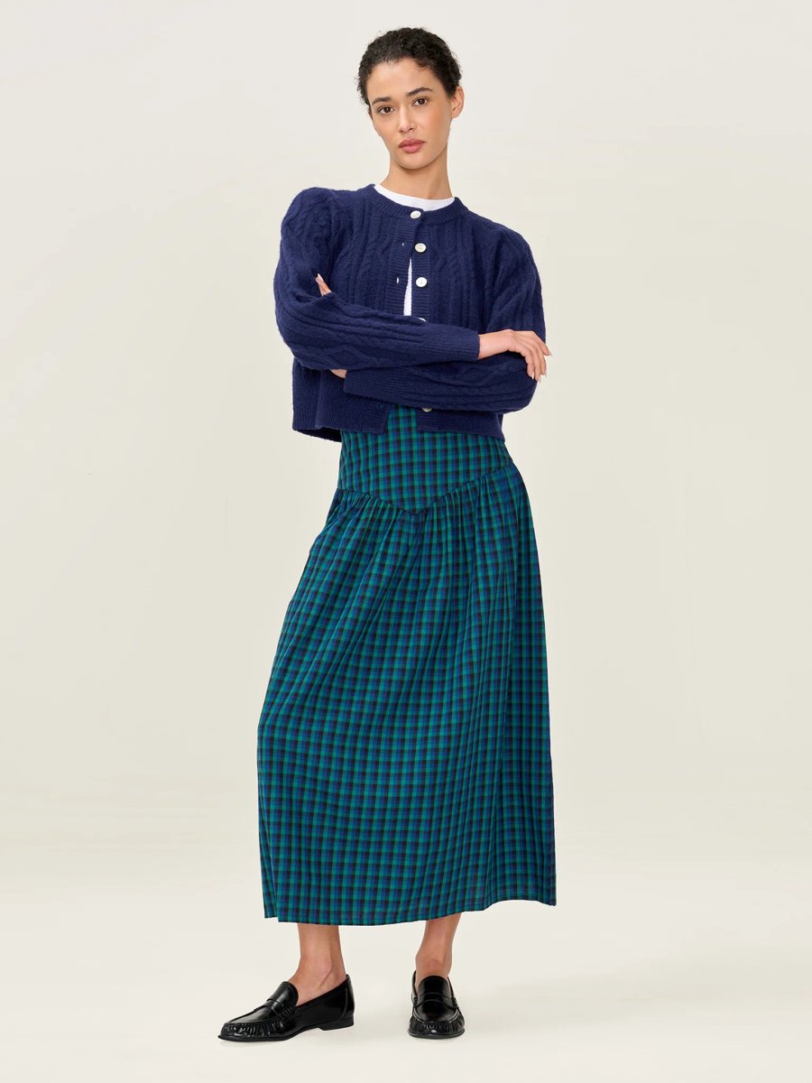 Midi-length Blue and Green Check Print Skirt made from soft, breathable cotton with a relaxed drop waist. The skirt flows into a full skirt and is easy to dress up or down, pairing perfectly with everything from simple tees to light layers.