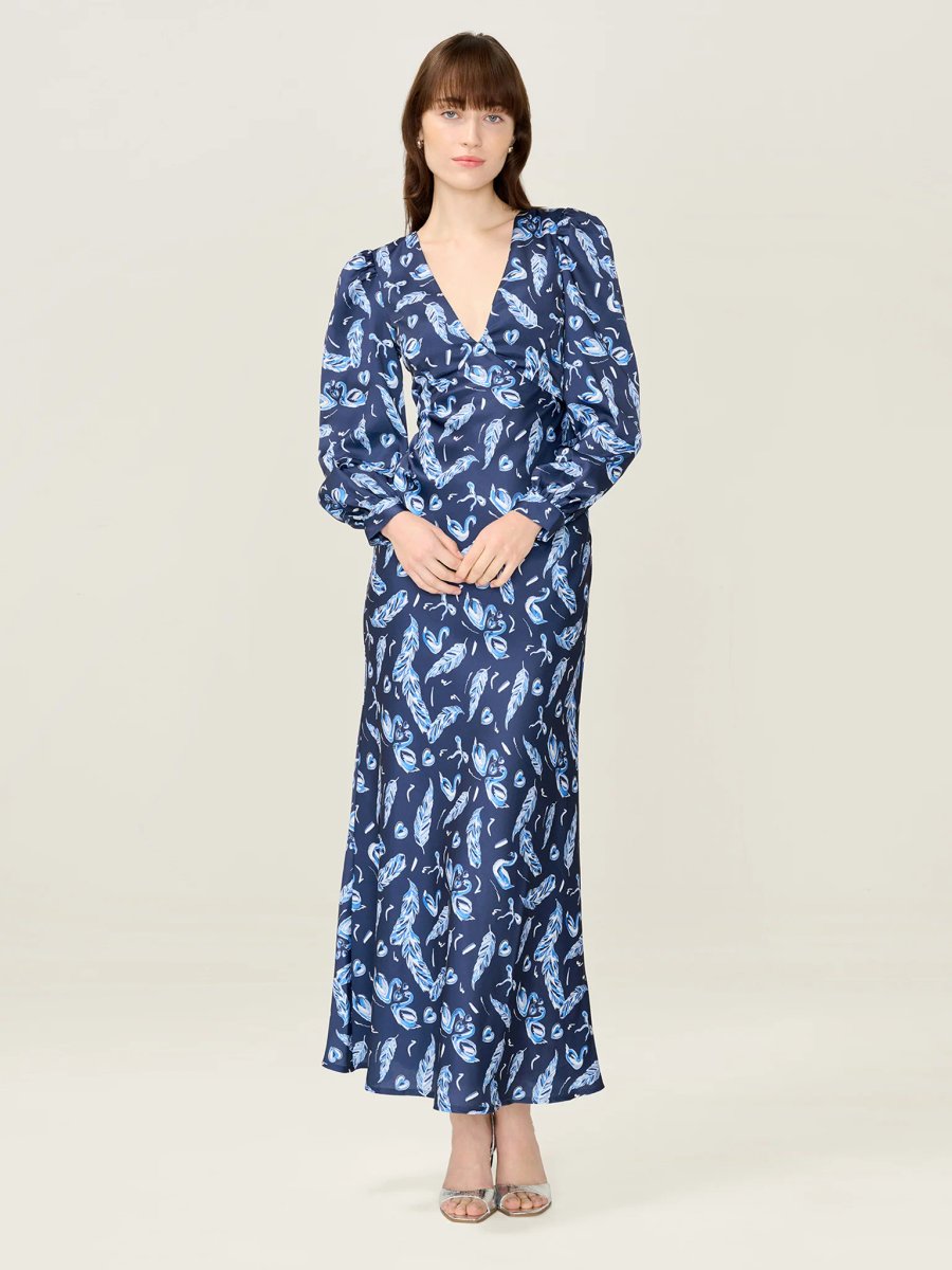 Designed with navy blue swan print, this elegant midi dress features a flattering empire line with long sleeves. The open back with a sash tie and delicate button fastening at the neck elevates the playful silhouette.