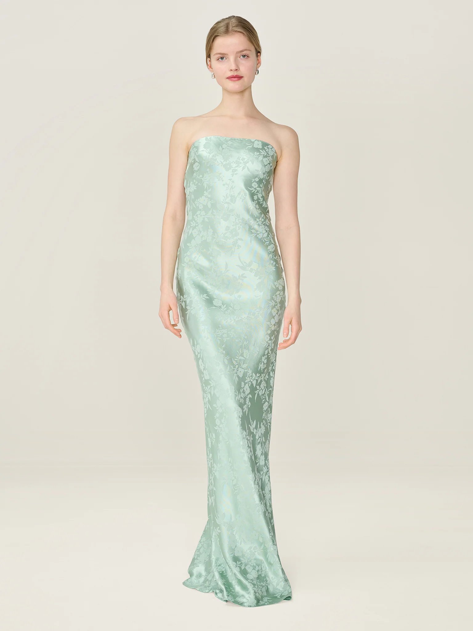 Simple, strapless and stunning; the Amdra is all that and more. Crafted from a slinky LENZINGª ECOVEROª Viscose blend in a gorgeous sage green floral jacquard, it's fitted throughout to enhance the elegance of your figure.