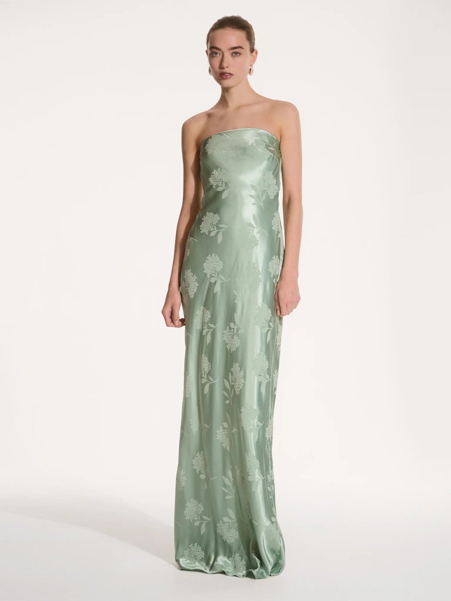A stunning sage floral jacquard maxi dress, perfect for any special occasion. The dress features a strapless neckline, a fitted silhouette, and lightweight satin fabric with a beautiful floral pattern. Ideal for formal events, evening wear, and bridal parties.