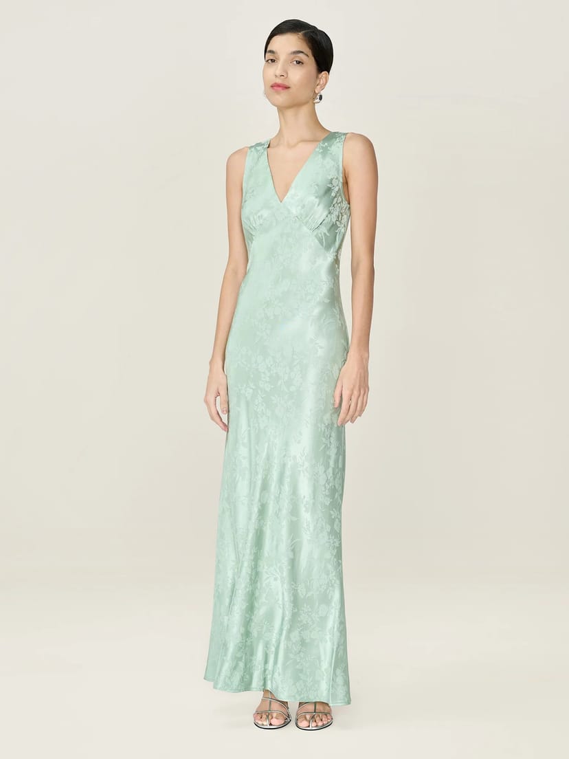 The OMNES Floral Jacquard Slip Dress in Sage is available in sizes 10, 12, 14, 16, 18, 20, 22, 24, 4, 6, 8.