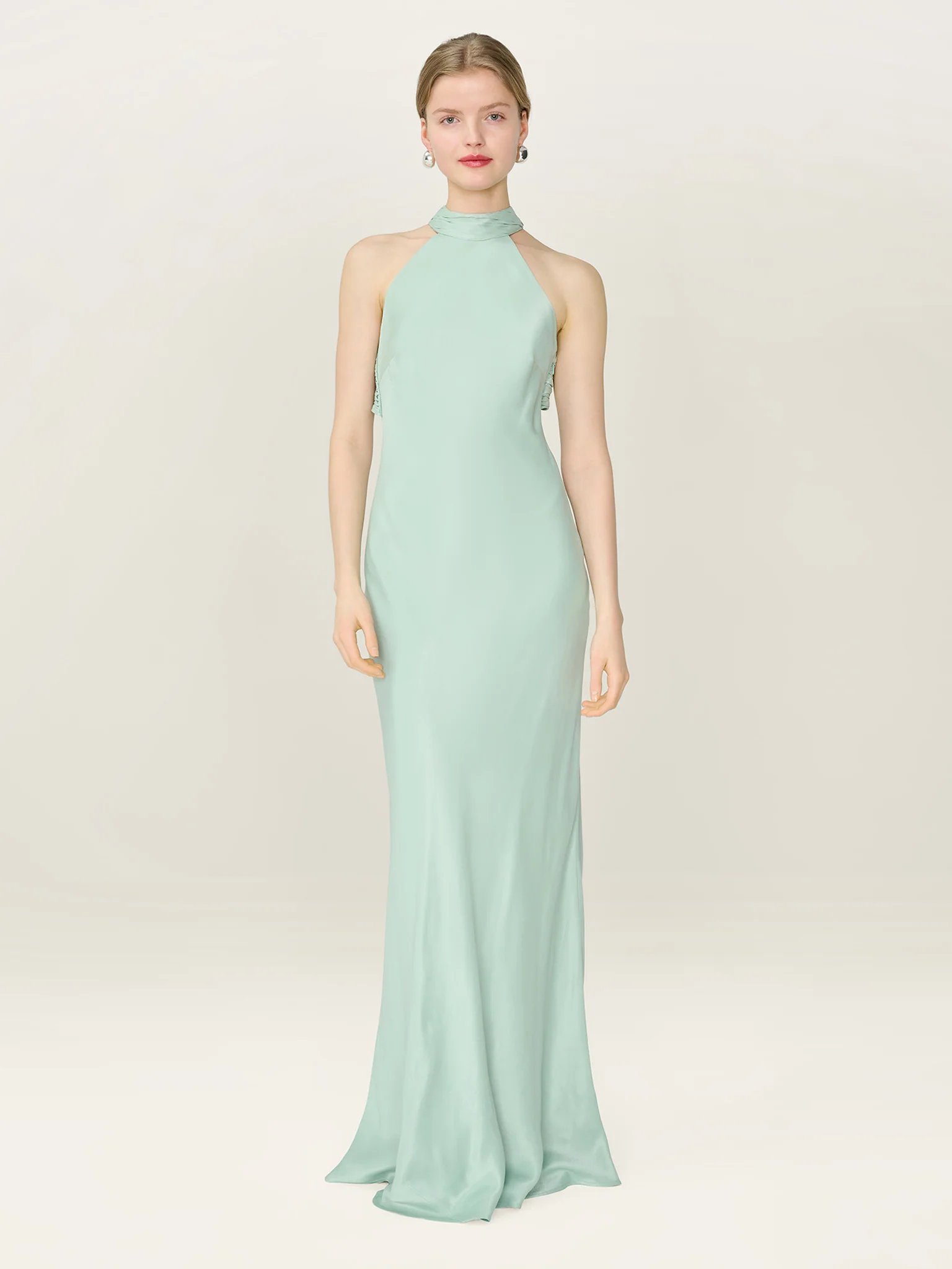 Designed with sage green, soft halter neckline that ties at the back in a romantic bow, framing an open back with subtle drama. The fluid drape moves beautifully; perfect for your next event.