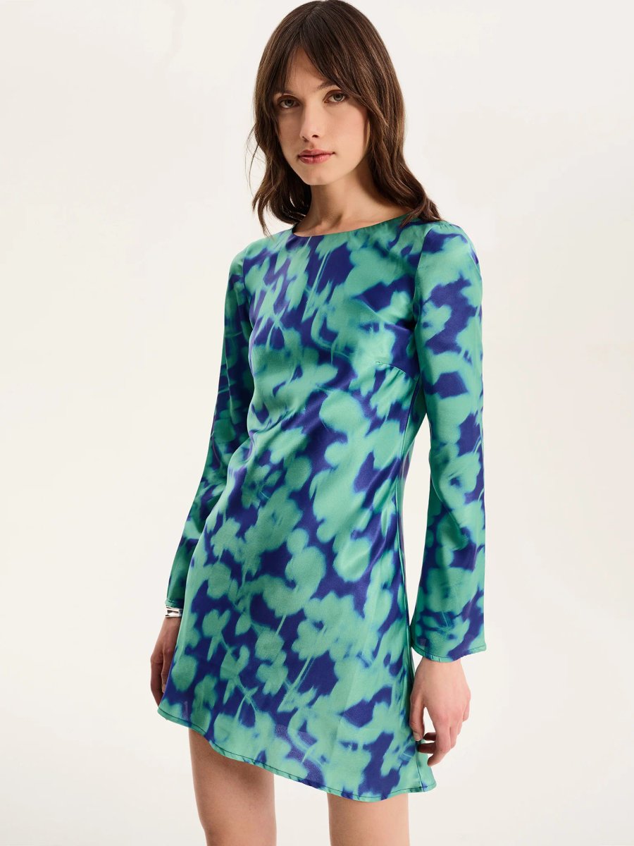 Adorned with long floaty sleeves and a high neckline, the Roberta dress features a low scoop back. Crafted from silky recycled satin, this mini dress boasts a blue and green blurred floral print with a tie detail at the top of the back.