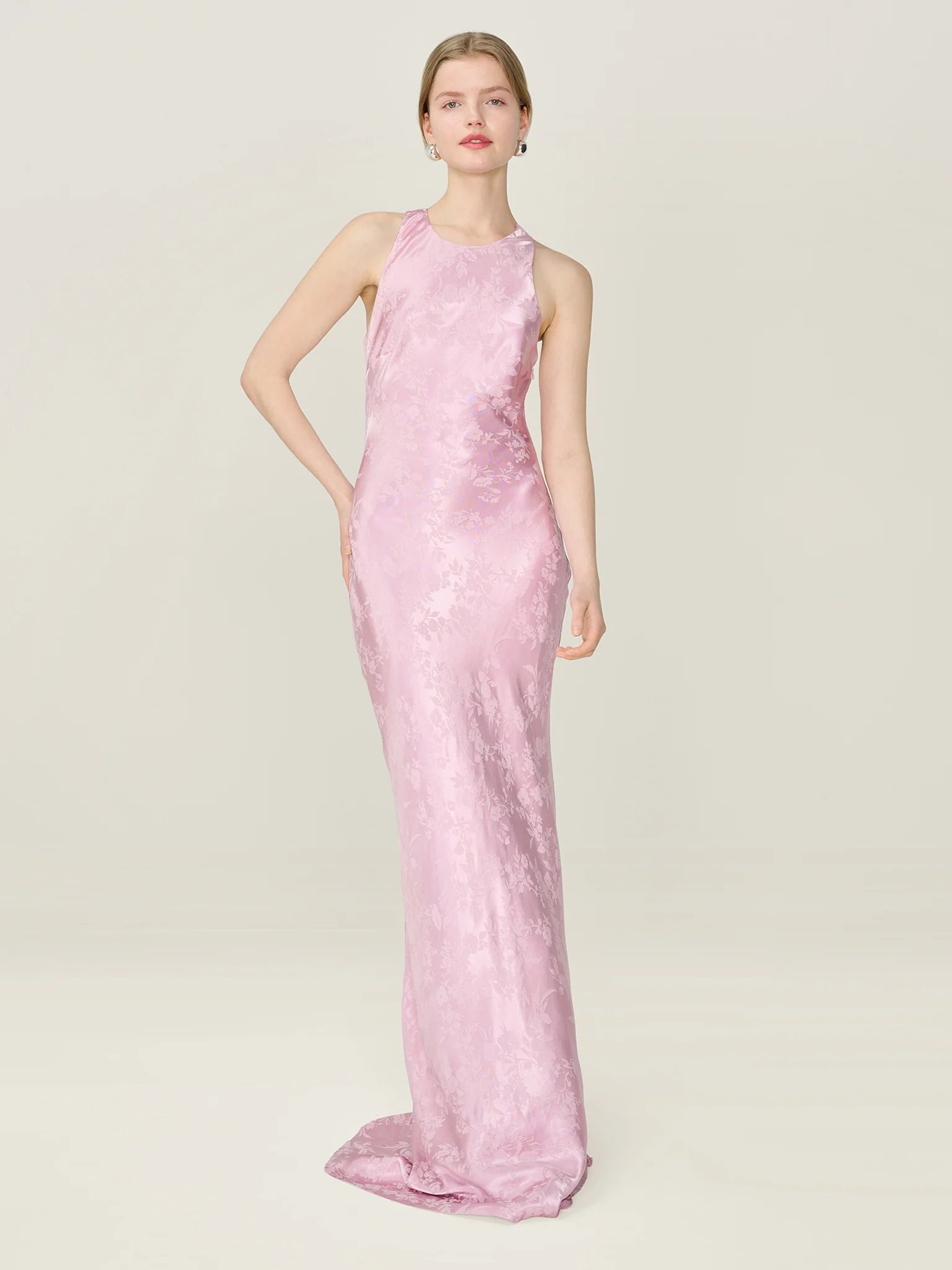The Jai Dress by OMNES is designed to impress. Made from floral jacquard Lenzingª Ecoveroª viscose, it boasts a high neckline and open scooped back with elegant crossover straps. This puddle-length silhouette flows gracefully, making a refined statement. Ideal for bridesmaids, the dress offers extra length in the skirt for a perfect fit.