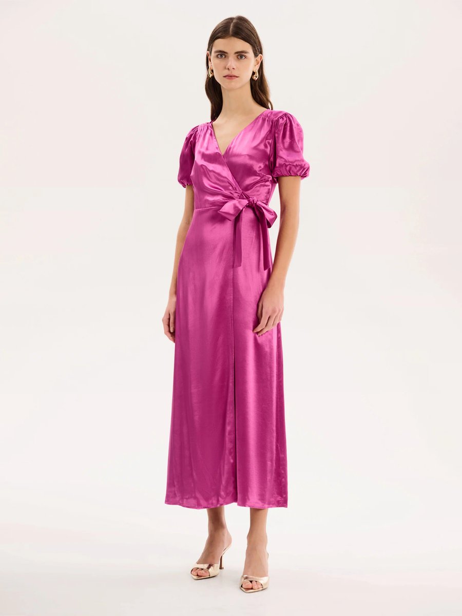 The OMNES Magenta Citrine Wrap Dress in Magenta is ideal for evening, formal, party.