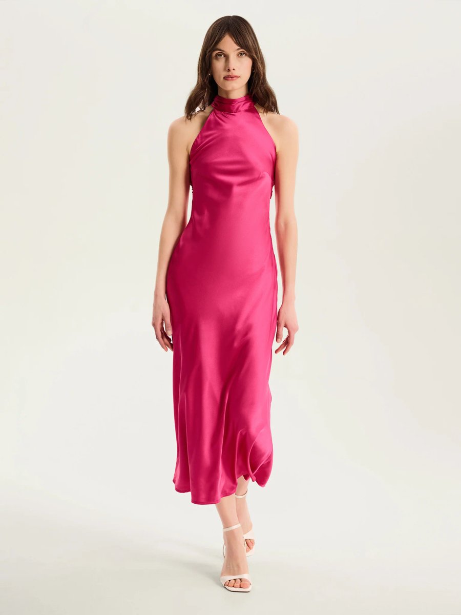 A captivating Magenta Satin-Like midi dress, Seychelles from OMNES. This piece features a halter neck, drape-framed back, and sleek silhouette. Crafted with satin-like recycled polyester, it offers the perfect mix of elegance and comfort for your next party. Suitable for evening events and special occasions, it promises to make a statement.