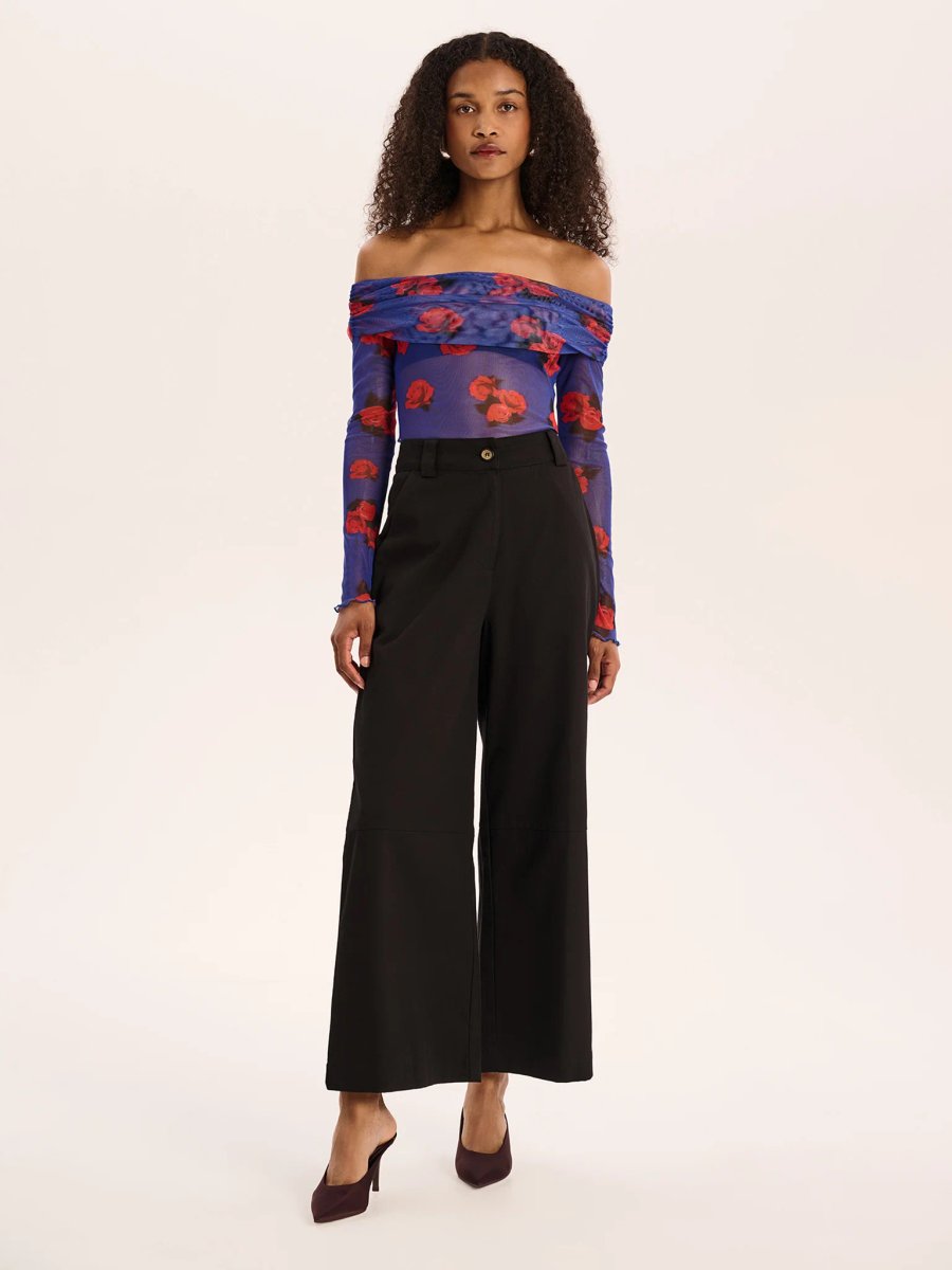 This long sleeve bardot top from OMNES is crafted from a form-fitting mesh with a playful lettuce frill trim. It features a bold cobalt rose print with a ruched detail across the neckline, making it sheer enough to show the silhouette of your favorite planet-friendly lingerie. Perfect for adding a playful touch to your everyday outfits.