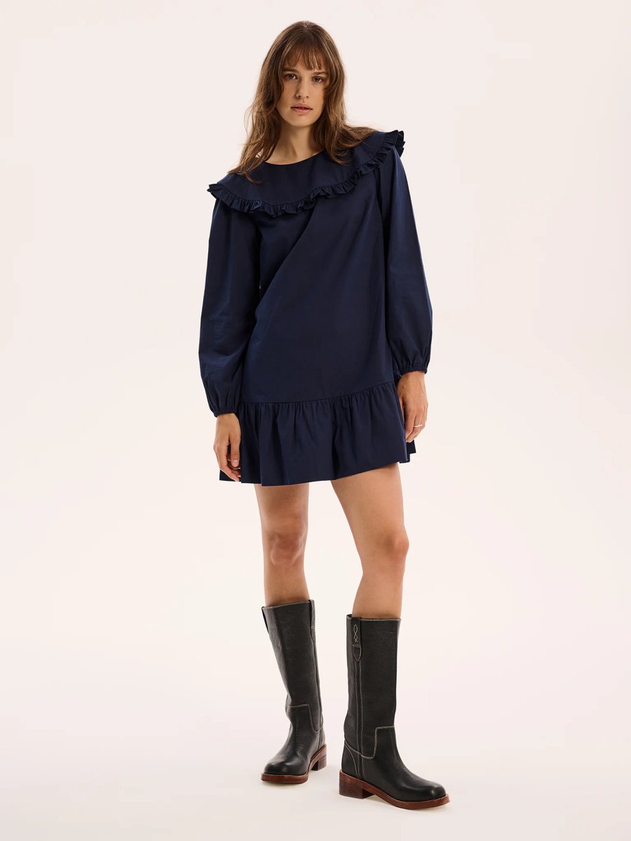 Crafted from ethically sourced BCI member cotton, the Emili Mini Dress by OMNES is a fun and frilly navy blue dress featuring a boat neck silhouette with an oversized ruffle collar and ruffled hem along the skirt. Ideal for layering with your favorite knitwear for year-round wear.