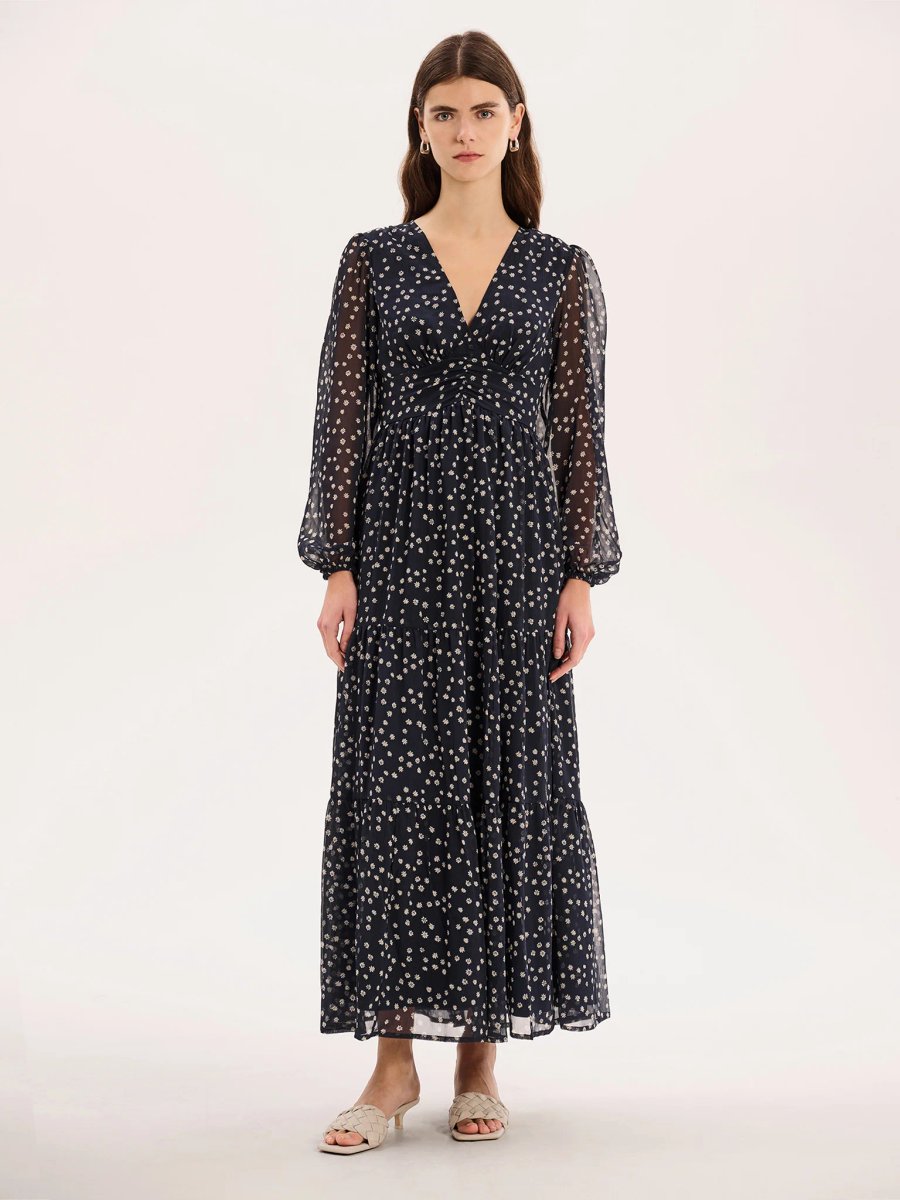 Designed with a classic vintage silhouette and a boho twist, this Marco dress by OMNES is your perfect floaty midi dress. Crafted from soft gathered details in sheer chiffon fabric, it features a micro daisy print. This long-sleeved dress boasts a slight puff detail, a tiered skirt, and a ruched front that gently drapes over the body to flatter your shape.