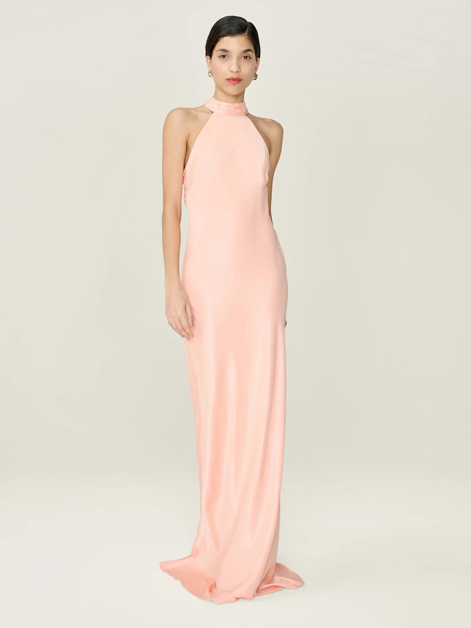 Designed with bridesmaids in mind, Milos pairs elegant detailing with a floor-length silhouette. Crafted in a peach hue, it features a soft halter neckline that ties at the back in a romantic bow, framing an open back with subtle drama. The fluid drape moves beautifully; perfect for your next event.
